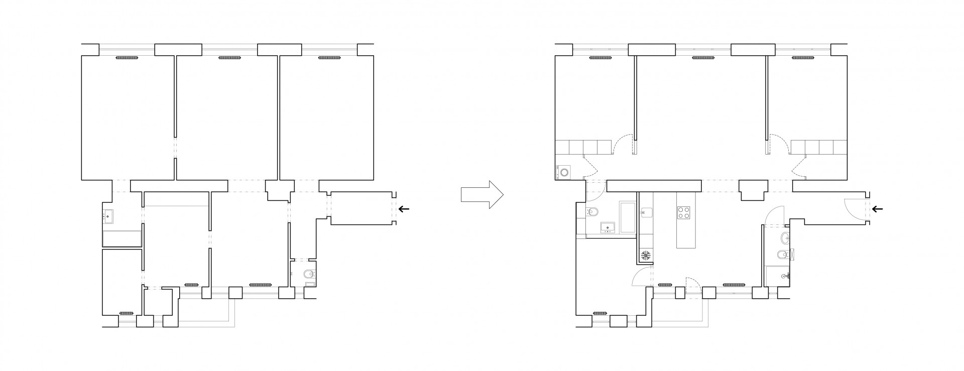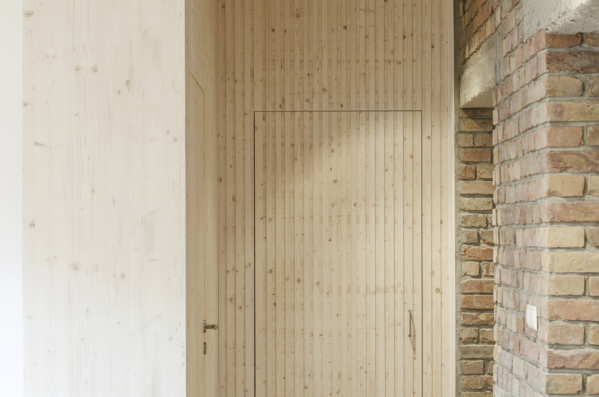 Nový návrh je doslova holobyt, bez nároku na zásahy do interiérového dizajnu. Sofa, jedálenský stôl, mobiliár, doplnky boli tabu. Nosnou témou sú stavebné úpravy a minimalizácia materiálov s jasným odkazom na dom a jeho históriu. Materiály sú zámerne konvenčné, sledujú jednotenie. Šatníky a sklady sú súčasťou stavebného interiéru.