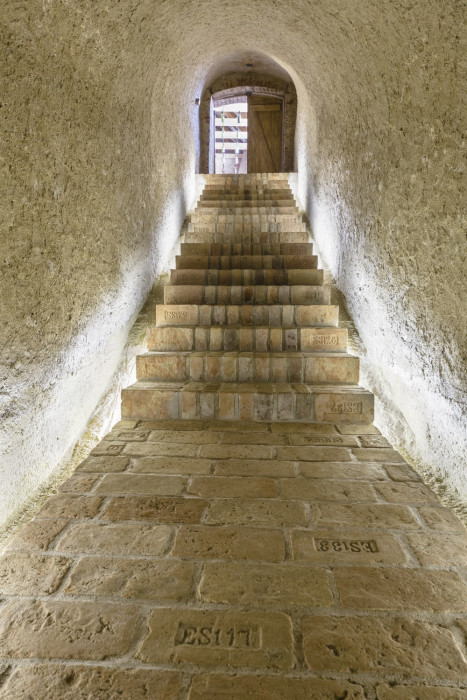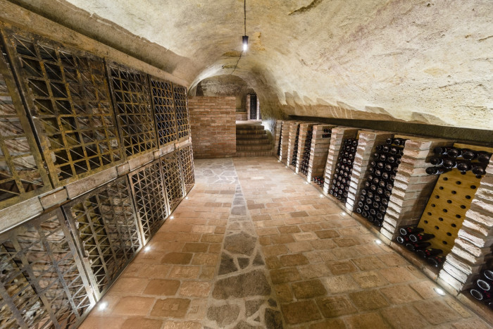 Uvnitř sklepa jsem pracoval s cihlou, kamenem a umělým osvětlením. Použití omítky bylo ve velmi omezené míře použito pouze v místě destrukce vstupní chodby. Z cihel jsou navrženy pevné geometrické tvary chodníků a kójí na víno, do chodníků bylo integrováno osvětlení. Spojnice mezi nimi jsou z volně ložených kamenů. Vnitřní osvětlení má několik nezávisle spínaných okruhů, jimiž lze měnit vnitřní atmosféru sklepa.