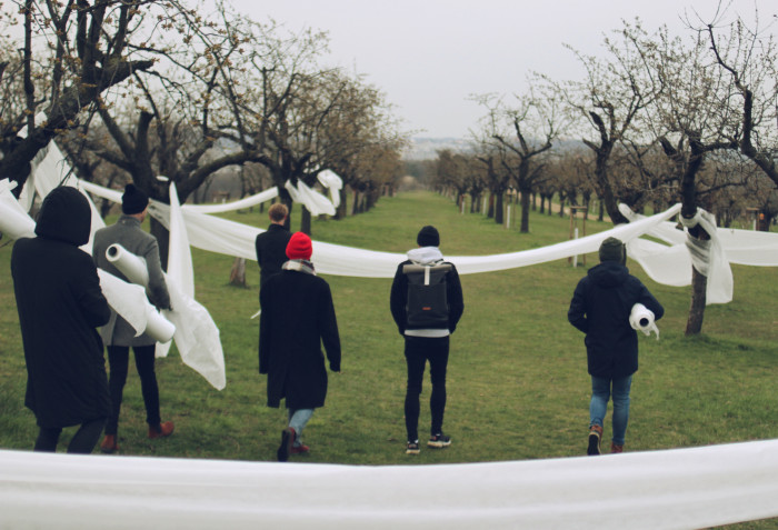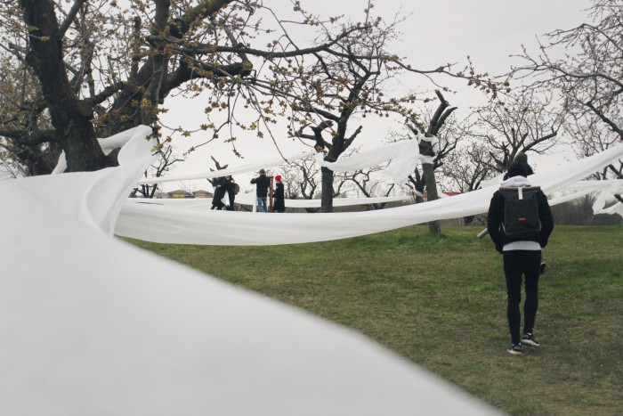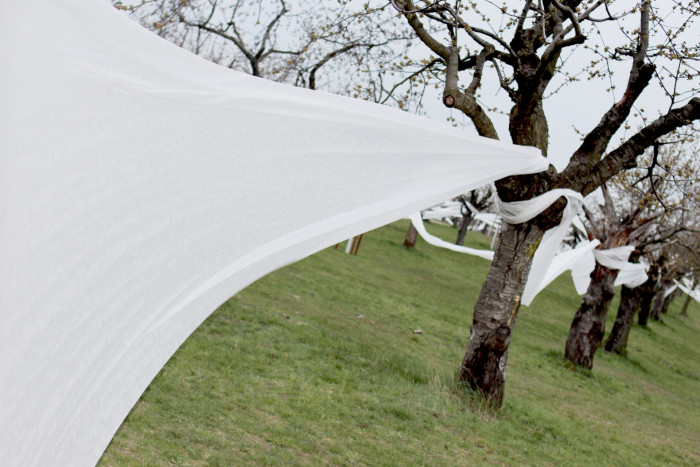 Instalace bude hotová, až třešně rozkvetou, květenství je tak podřízena doba, mezi třešněmi bude ale ve všech fázích, například i tehdy, až větrem budou poletovat odkvetlé okvětní lístky a mezi bílou látkou a starými třešněmi bude chumelit. Najednou nebude látka tou krátkodobou záležitostí.