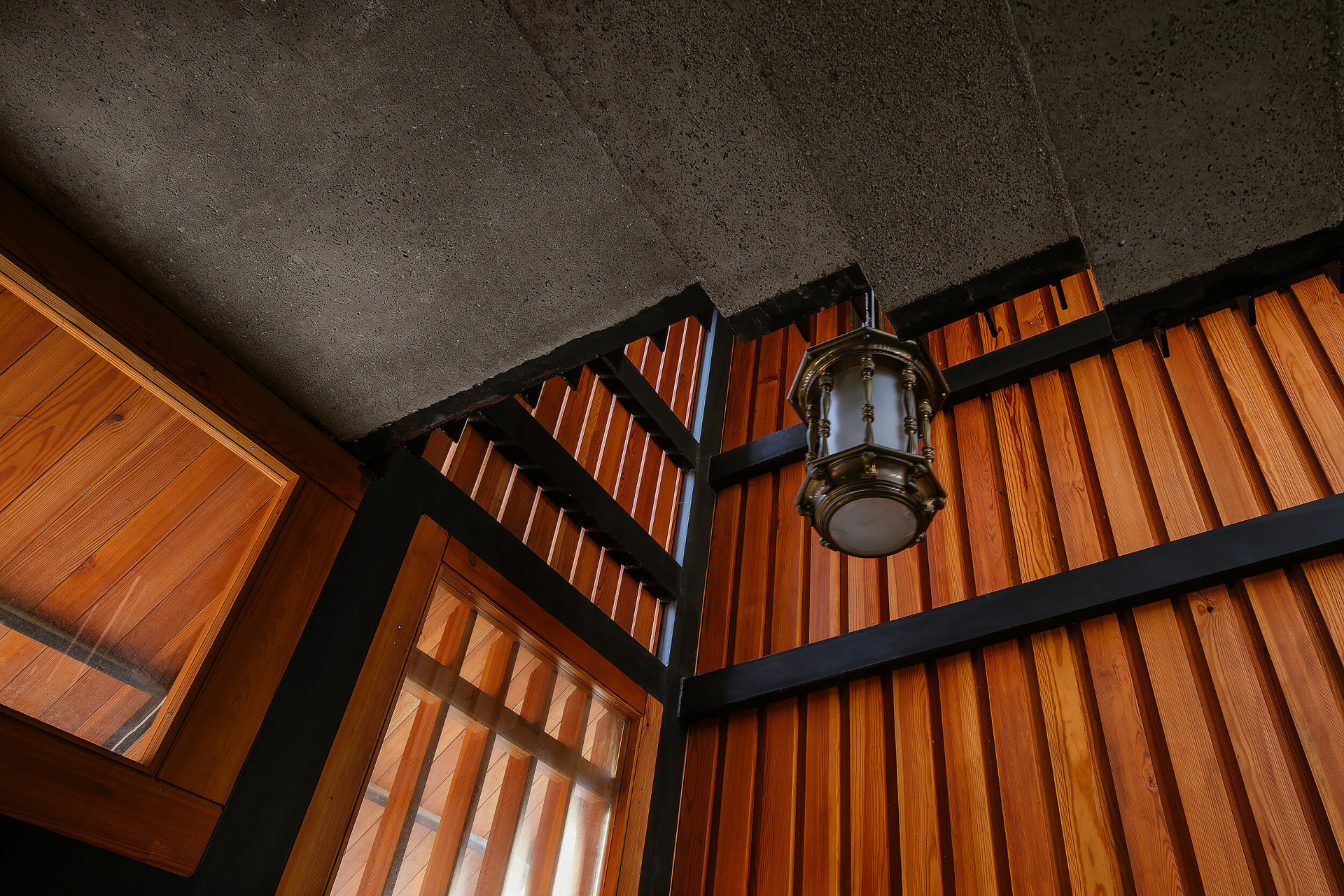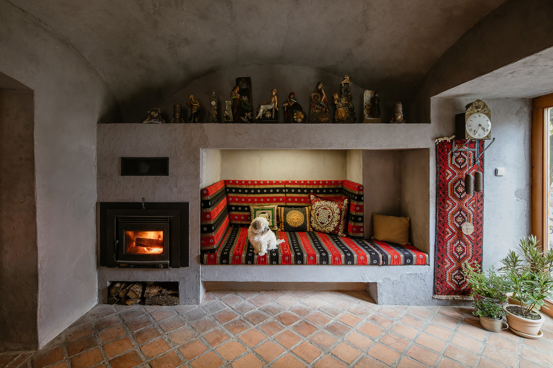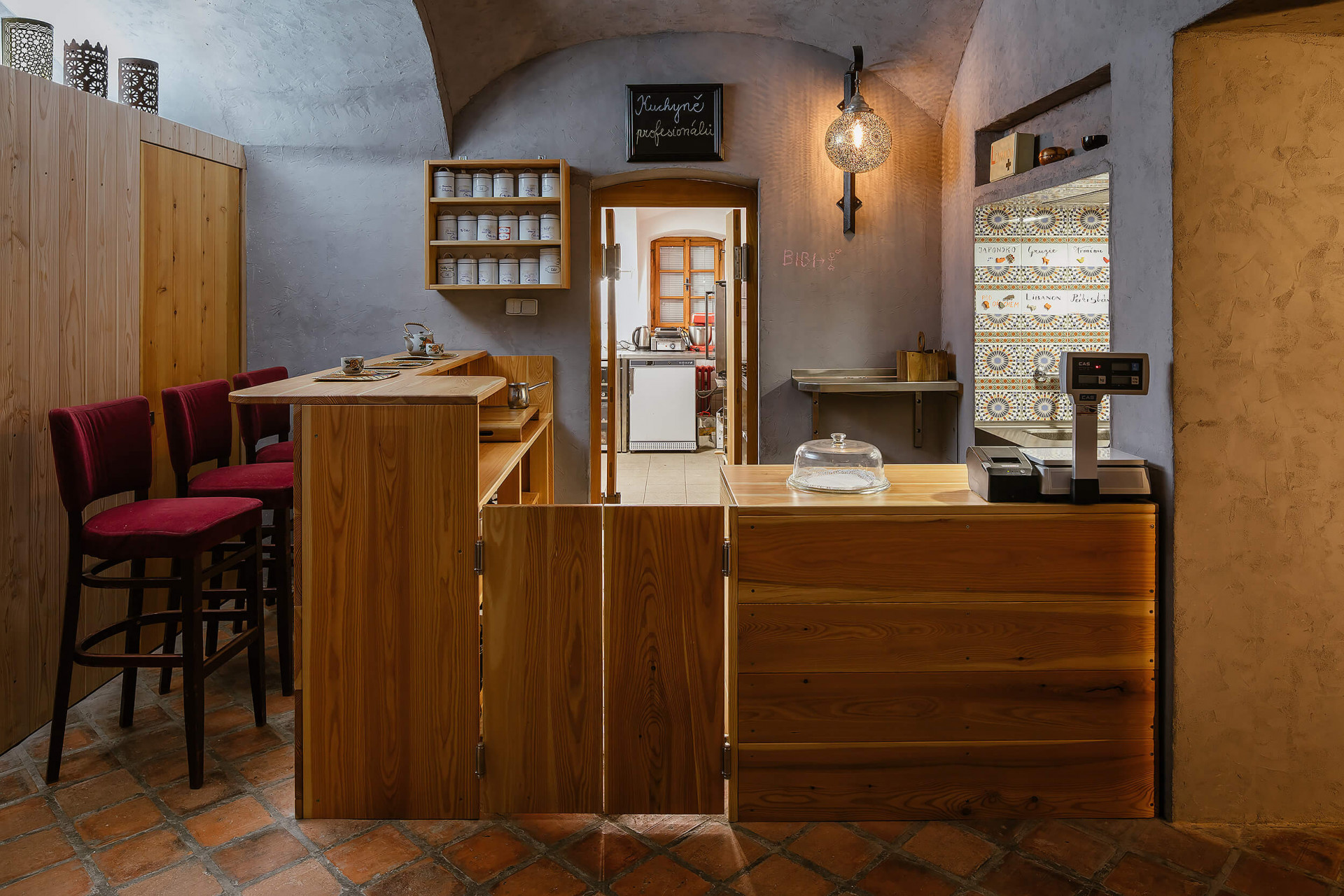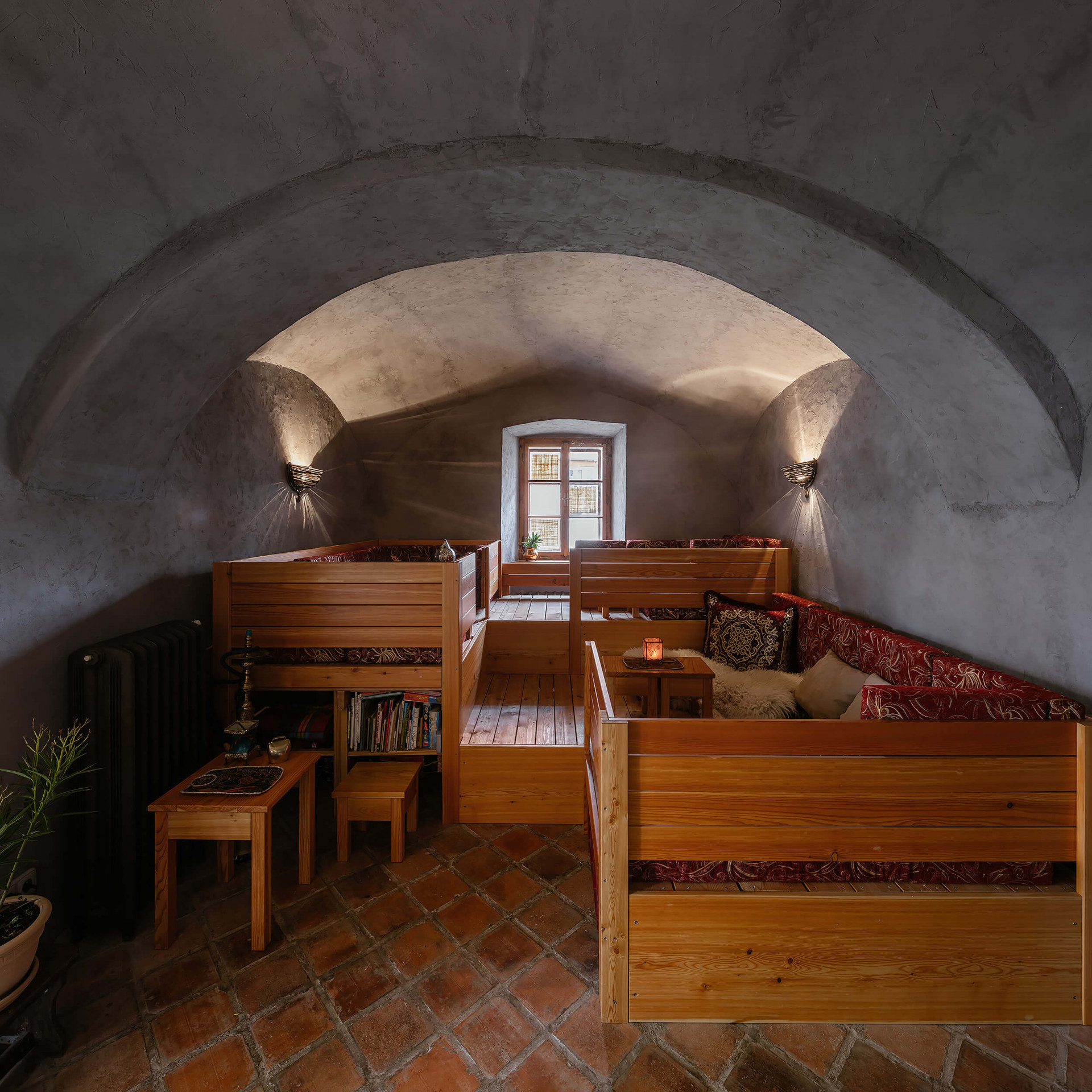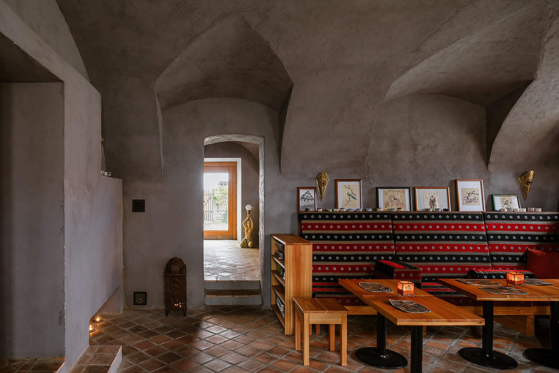 Čajovna v přízemí, kterou si majitel vysnil během svých cestovatelských výprav po světě, dává duši celému domu. Je rozprostřena do několika místností, z nichž každá má charakteristický plastický prvek ve svém průčelí, který odkazuje na členitost štítové fasády. Hlavní pobytová místnost je pak snížena o dva schody, aby získala monumentálnější měřítko ve srovnání s intimnější povahou okolních místností. Každý prostor nabízí různé způsoby posezení, které se liší mírou intimity a společenské interakce.