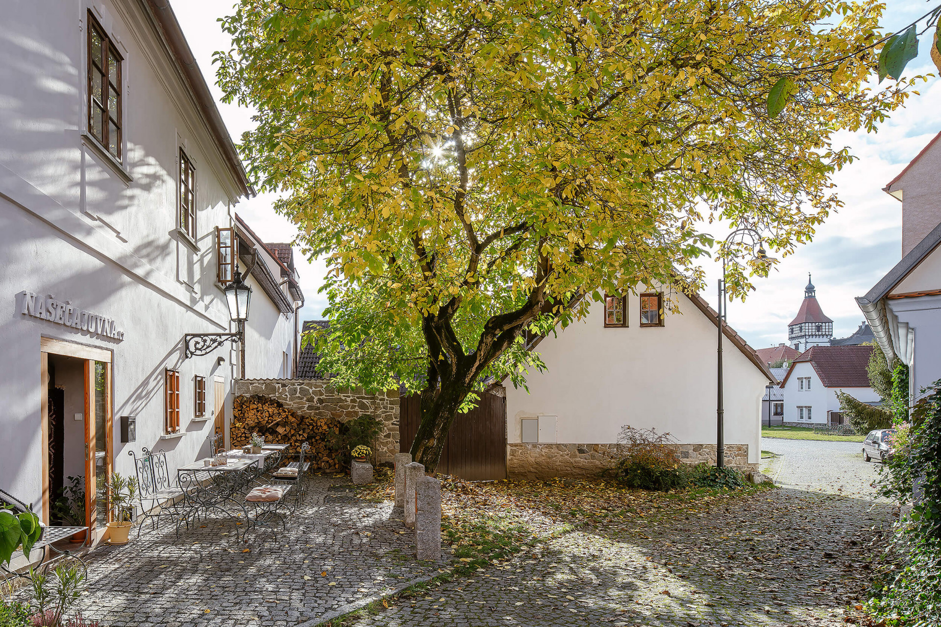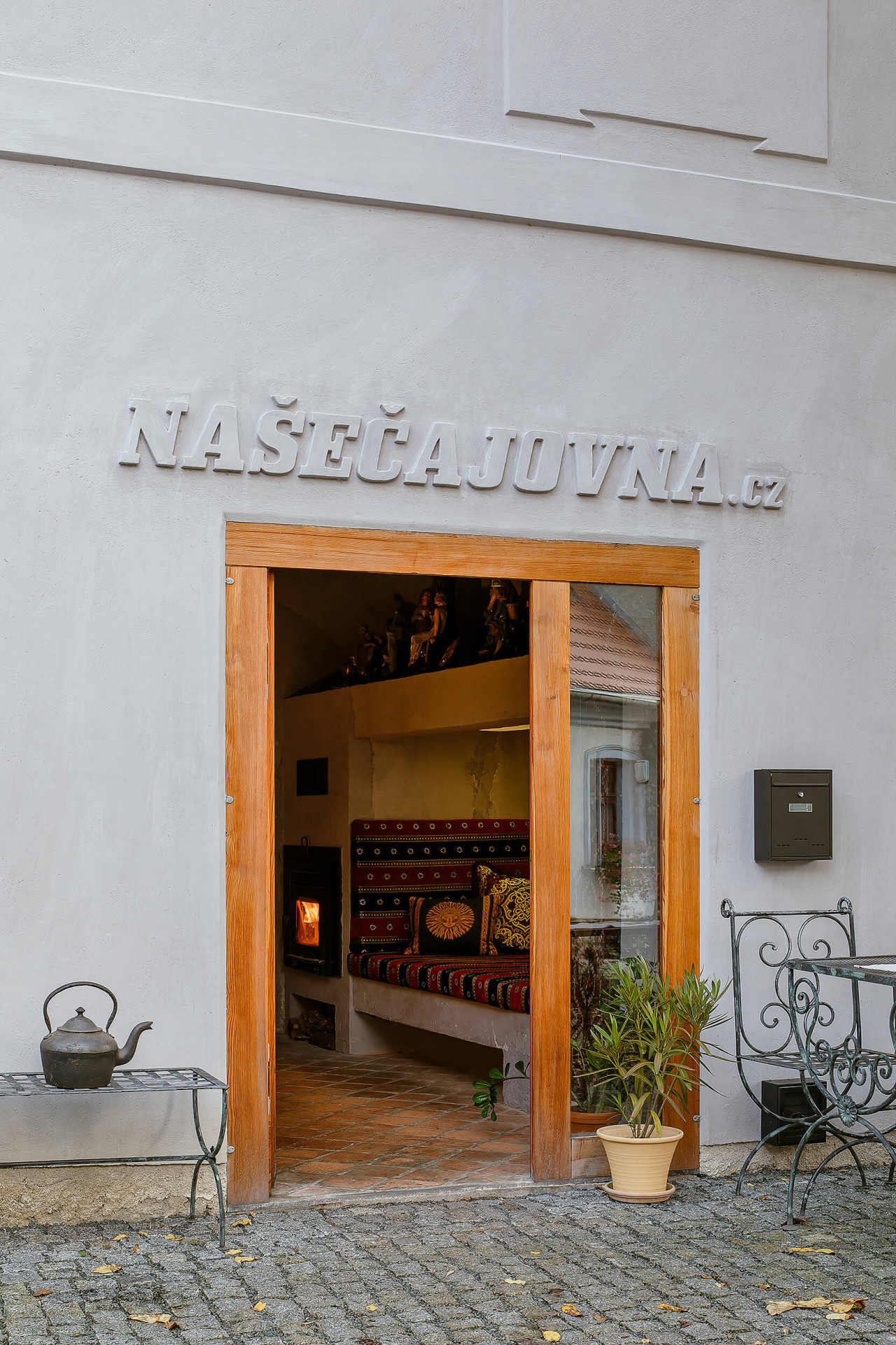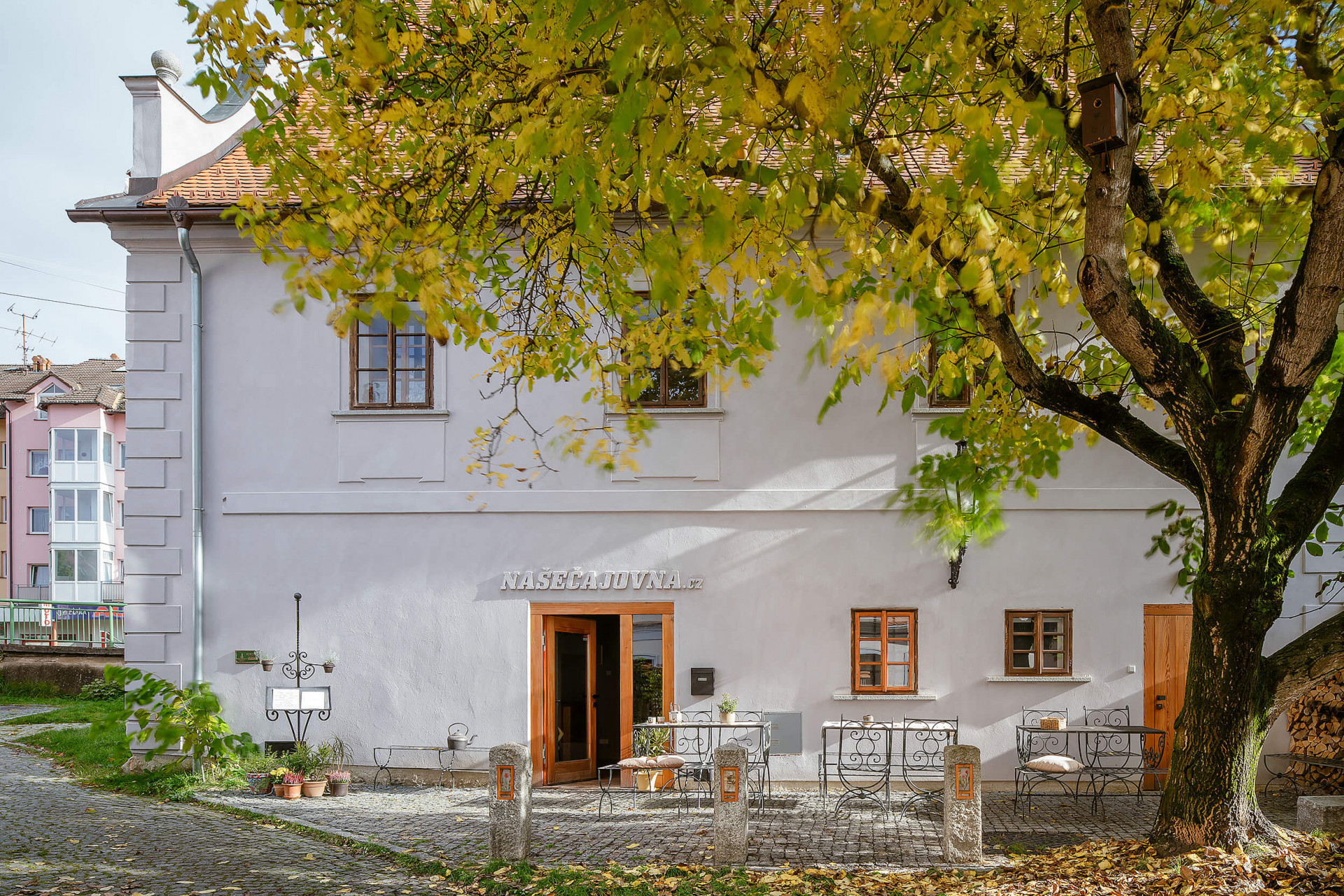 Na interiér čajovny přímo navazuje pobytový dvorek s posezením pod starým ořechem, který je otočený do dochované části staré blatenské zástavby a de facto rozšiřuje veřejný prostor na soukromý pozemek majitele.