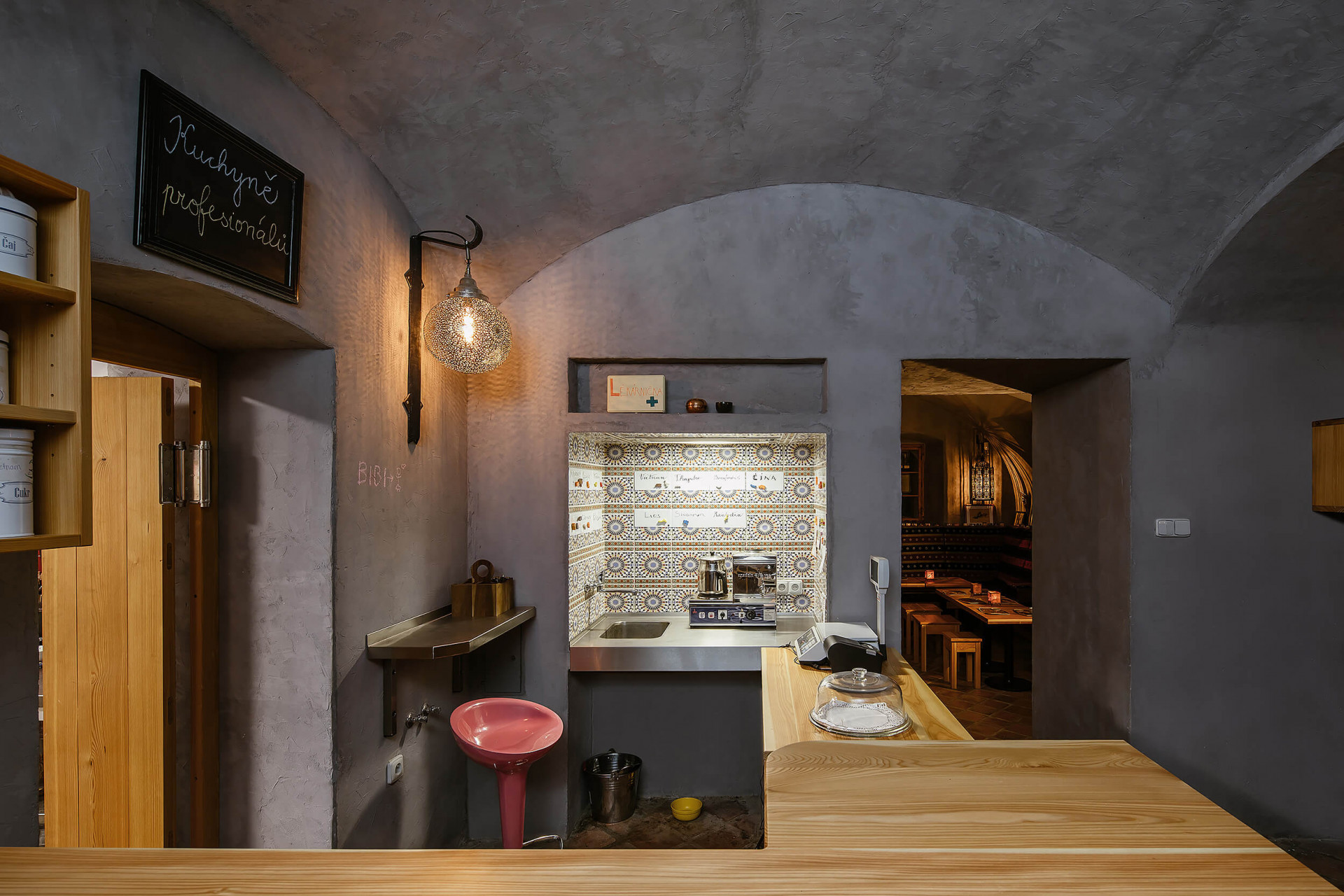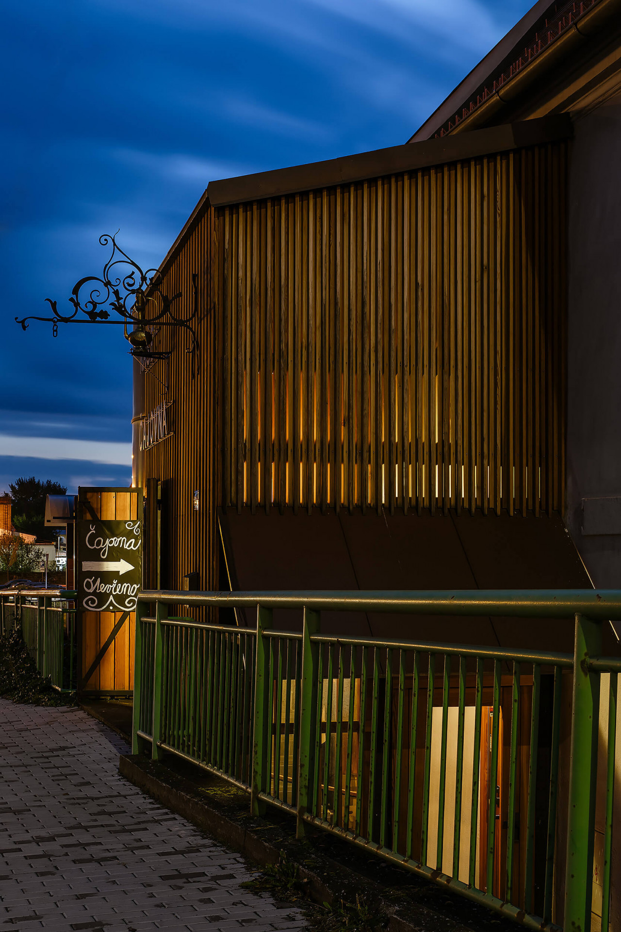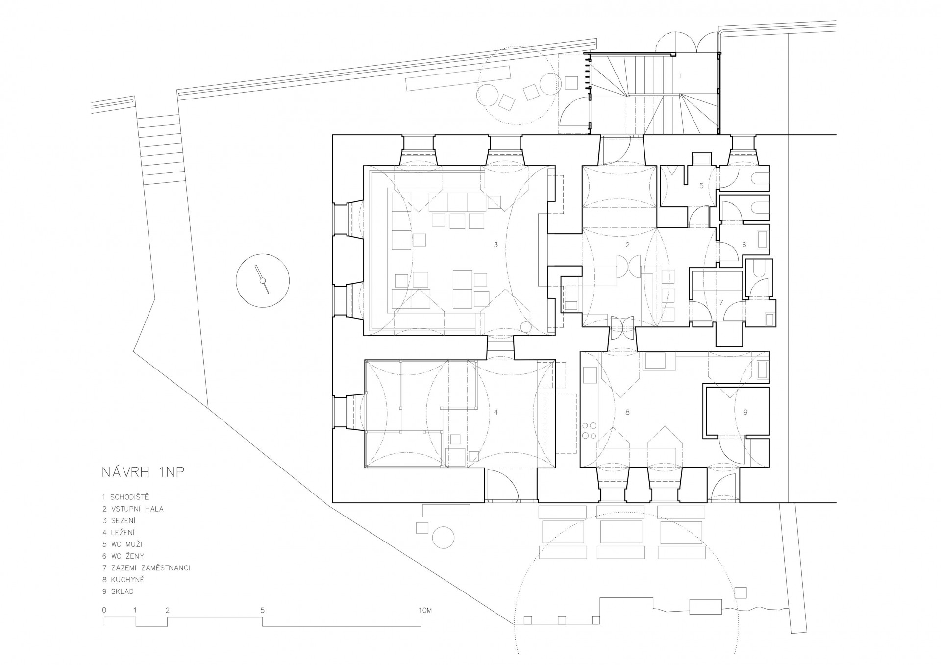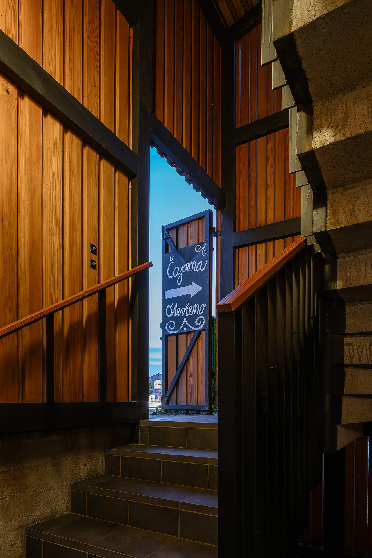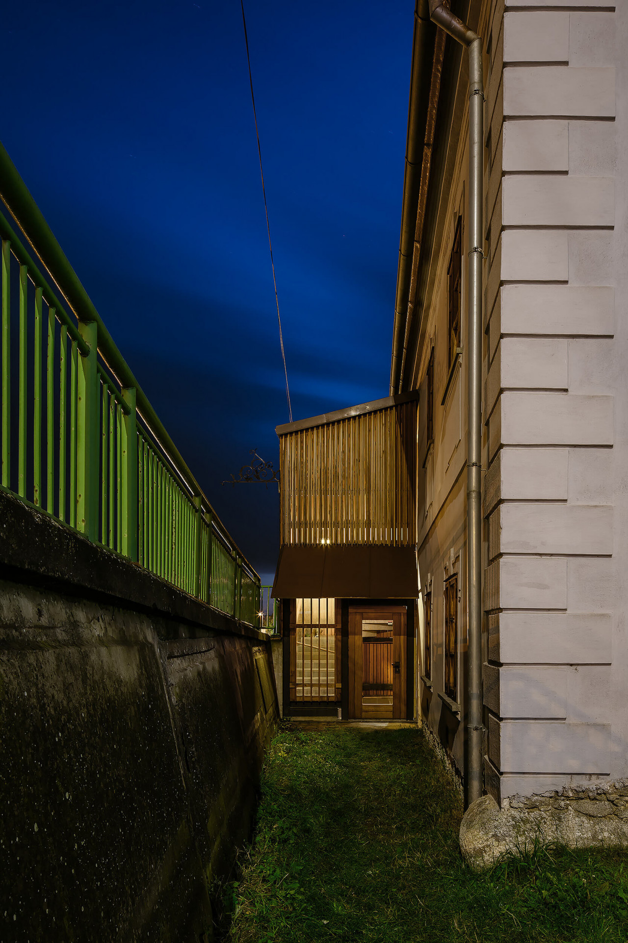 Zbudování vstupní schodišťové přístavby k objektu je odpovědí na tuto problematickou polohu. Vnější kryté schodiště propojuje původní terén a vyvýšenou úroveň chodníku podél komunikace a a pokračuje i do horního patra objektu. Nahrazuje tak zároveň vnitřní schodiště, které se již do interiéru přízemí kapacitně nevešlo. V jeho místě vzniklo sociální zázemí restauračního provozu.