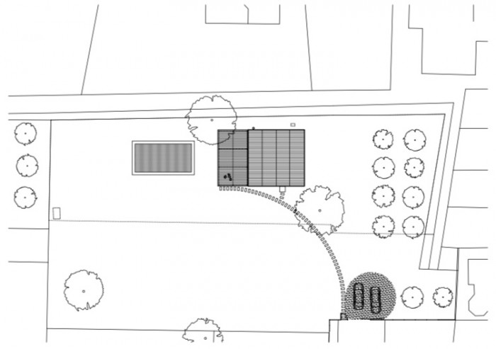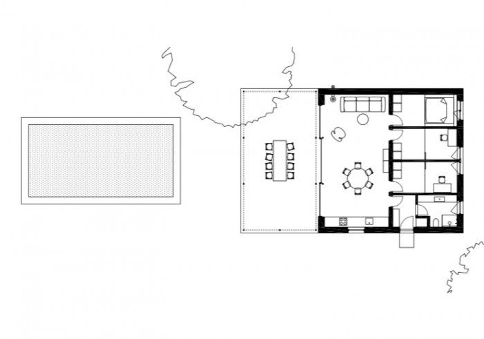 Dispozičná schéma je banálne jednoduchá, v dome nie je chodba a izby sú ako kajuty napojené priamo z hlavného denného priestoru. Konštrukčne sa jedná o jednoduchú murovanú stavbu s oceľovou konštrukciou strechy. Dom je omietnutý, má drevené okná a strešná krytina je z vlnitého plechu. Terasa je prekrytá vlnitým polykarbonátom, pod ktorým je stienenie z látky s reflexnými alumíniovými pásmi. Táto látka sa dá posúvať a meniť intenzitu preslnenia podľa potreby počas celého roka.