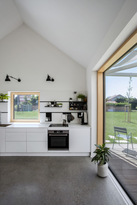 Dom je vykurovaný tepelným čerpadlom na vzduch, distribúcii a udržaniu tepla pomáha akumulačná podlaha z brúseného betónu.