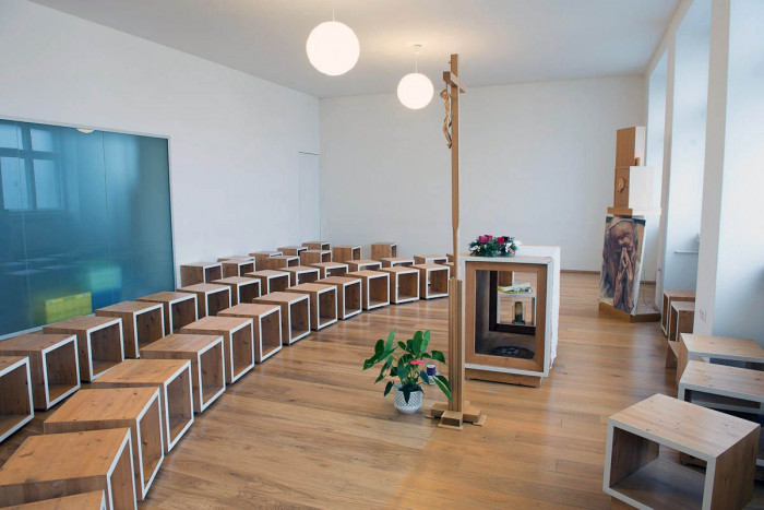 Část přízemí školy – učebna s příslušenstvím – se po oddělení od školního prostoru dostala pod správu farnosti Rajec. Kapli tak mají možnost kromě školy příležitostně využívat i ostatní obyvatelé Rajce. V prostoru se asanovaly příčky, podlahy a výplně otvorů. Metodou řezání pod vodou se vyřezaly v nosném zdivu další otvory mezi zádveřím, knihovnou a kaplí. Asanoval se také původní vstup z exteriéru. Do připravených otvorů byly vsazeny dveře s dřevěným obkladem a skleněná stěna. Také byla položena nová dubová podlaha. Umělecká designérka vypracovala návrh mobiliáře, který filozoficky propojila s konceptem stvořitele. Vytvořila „kostky“ na sezení, oltář i police na knihy.