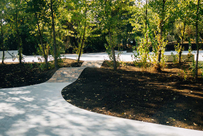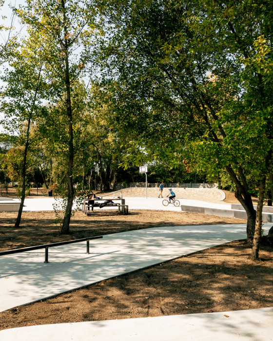 Na psí louku v zadní části parku se prochází skateparkem dvěma přístupovými cestami vyskládanými z betonové dlažby bez výrazných spár, které by vadily přejezdu na skateboardu. Tímto gestem dáváme jasně najevo prostupnost skrze skatepark a splňujeme dva naše cíle, kterými jsou pohodlné spojení s psí loukou a zachování co možná nejdelší plochy pro kolečkové sporty.