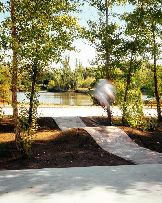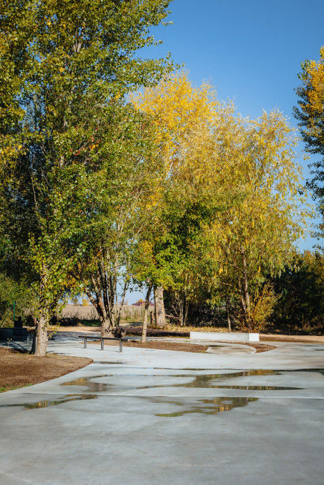 V návrhu jsme se snažili co možná nejvíce zachovat atmosféru klidného místa, schovaného za továrnou Baumit, v blízkosti rybníku a zámeckého parku. Proto jsme také zachovali náletovou zeleň, která se na ploše objevila po dobu, kdy byla nevyužívaná. Překážky a prvky pro skateboarding jsme volili tak, aby nenarušovaly svouvelikostí a způsobem, jakým jsou využívány, naši koncepci místa pro odpočinek. Proto se na ploše nachází většinou menší streetové prvky, určené pro začátečníky a technické jezdce. Díky propojení s přírodou a netradičnímu designu parku si však myslíme, že skatepark bude vyhledávaný i pokročilými jezdci.