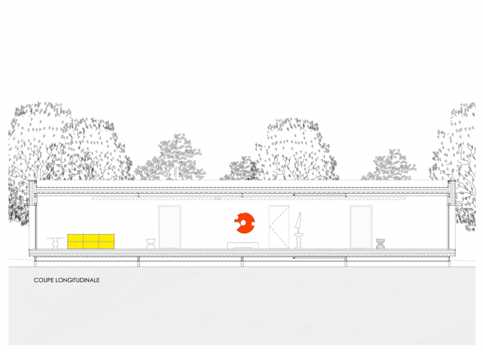 Půdorys má rozměry 20 na 6 metrů, je otevřený a umožňuje tak plynulý pohyb a flexibilní rozvržení. Na obě strany od ložnice a toalety se rozprostírá obývací pokoj a kancelář, propojené širokou chodbou využitou pro vystavování soch. K objemu jsou přidány dvě terasy; na jihozápadě zastřešený vchod a na severovýchodě venkovní prostor podél budovy krytý baldachýnem na kovové konstrukci.