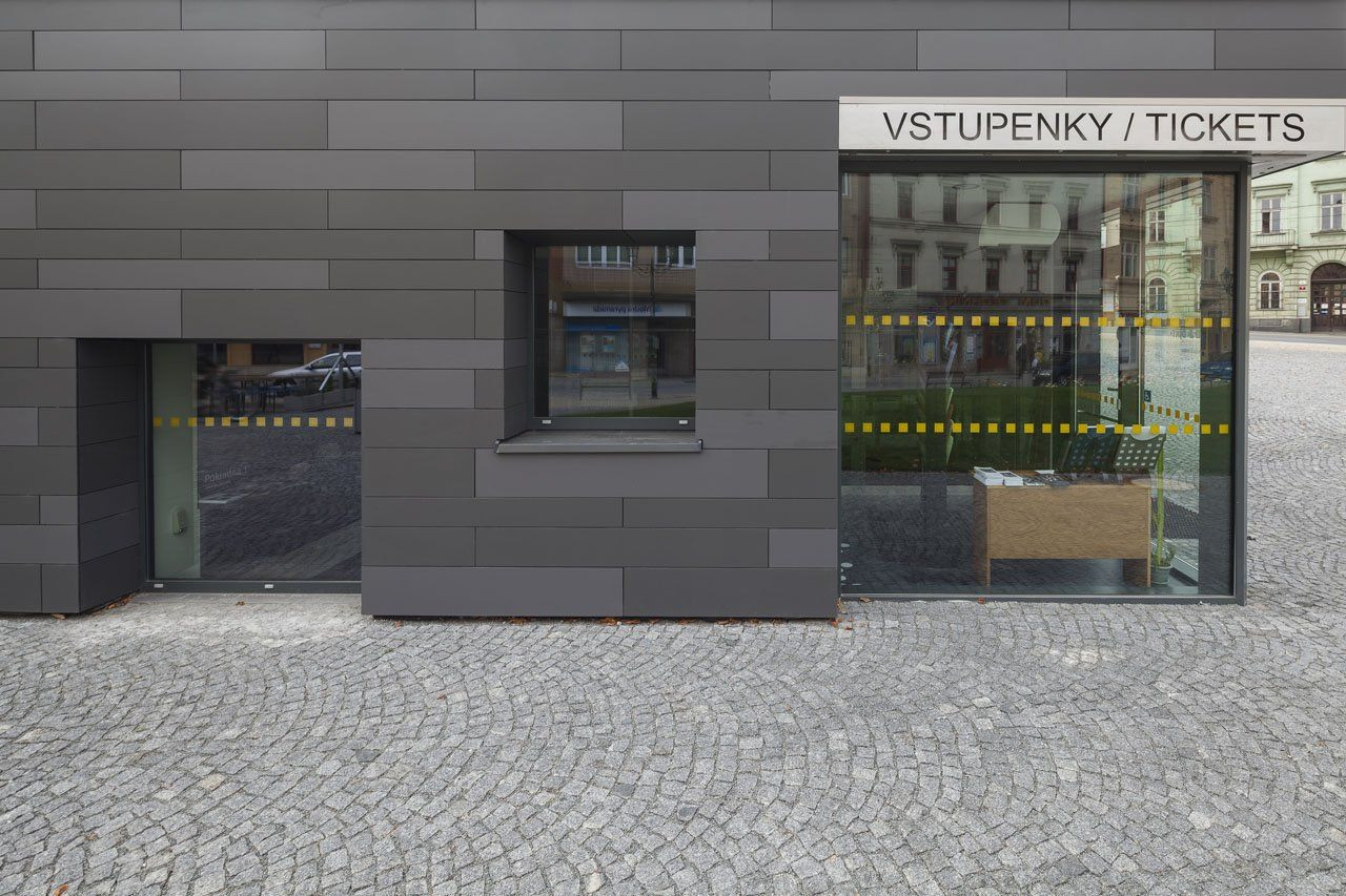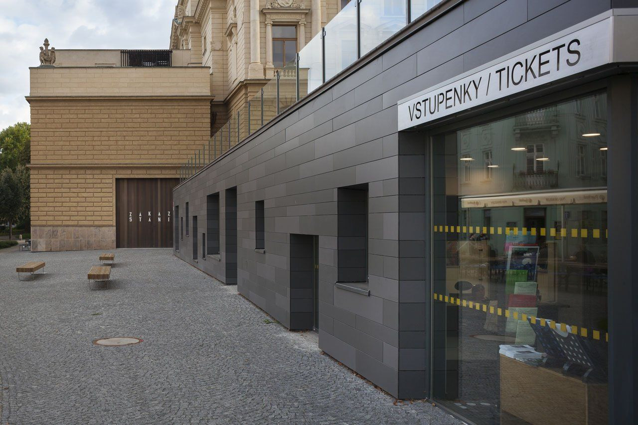 Původní architektonický výraz spojující jednoduchou přízemní podélnou hmotu s nenápadnou kamennou fasádou plně odrážel funkční náplň, a sice technickou část zázemí divadla. Původní kamenný obklad přístavby divadelního zázemí z 80. let byl nahrazen vláknocementovými fasádními deskami. Nový vzhled fasády ctí původní záměr, jenž má podtrhnout charakter budovy v kontextu s okolním terénem i samotnou budovou divadla. Tato provozní část tak představuje v podstatě „sokl“ a její vzhled má tento dojem umocňovat a také kompozičně jasně oddělit budovu zázemí od historického divadla. Autoři proto zvolili kombinaci dvou odstínů šedé barvy a rovněž horizontální rastr obkladových desek Cembrit Zenit, který podporuje přízemní podélný charakter budovy. Specifickou vlastností těchto fasádních desek je kombinace probarveného jádra neprůhledné barvy na povrchu, čímž je dosaženo dlouhodobé stálosti odstínů.Celkovému zlepšení vzhledu budovy rovněž výrazně napomohlo nové rastrování okenních výplní.