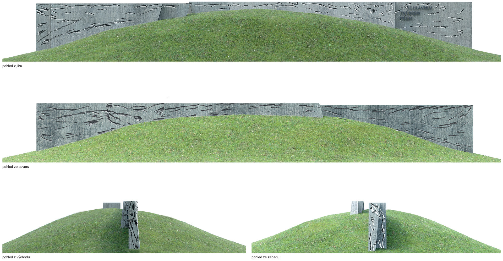 Zanedbaný plácek s pozapomenutou Galerií cti je obklopený samými dominantami – parkem, náměstím, dopravní tepnou, kruhovým objezdem s korunou a obchoďákem. Navrhujeme obyčejný prostor, který je doplňuje – travnatý parčík s kopcem ukrývajícím zeď.