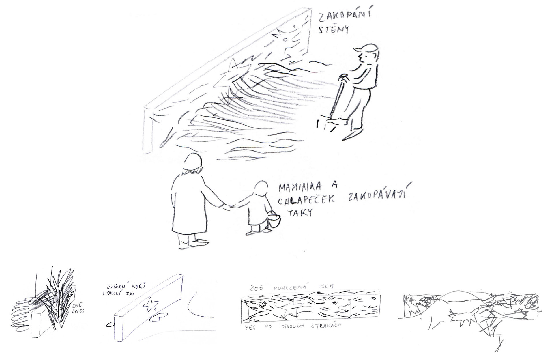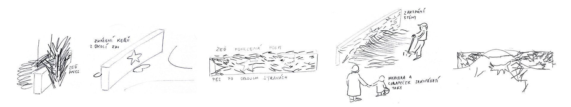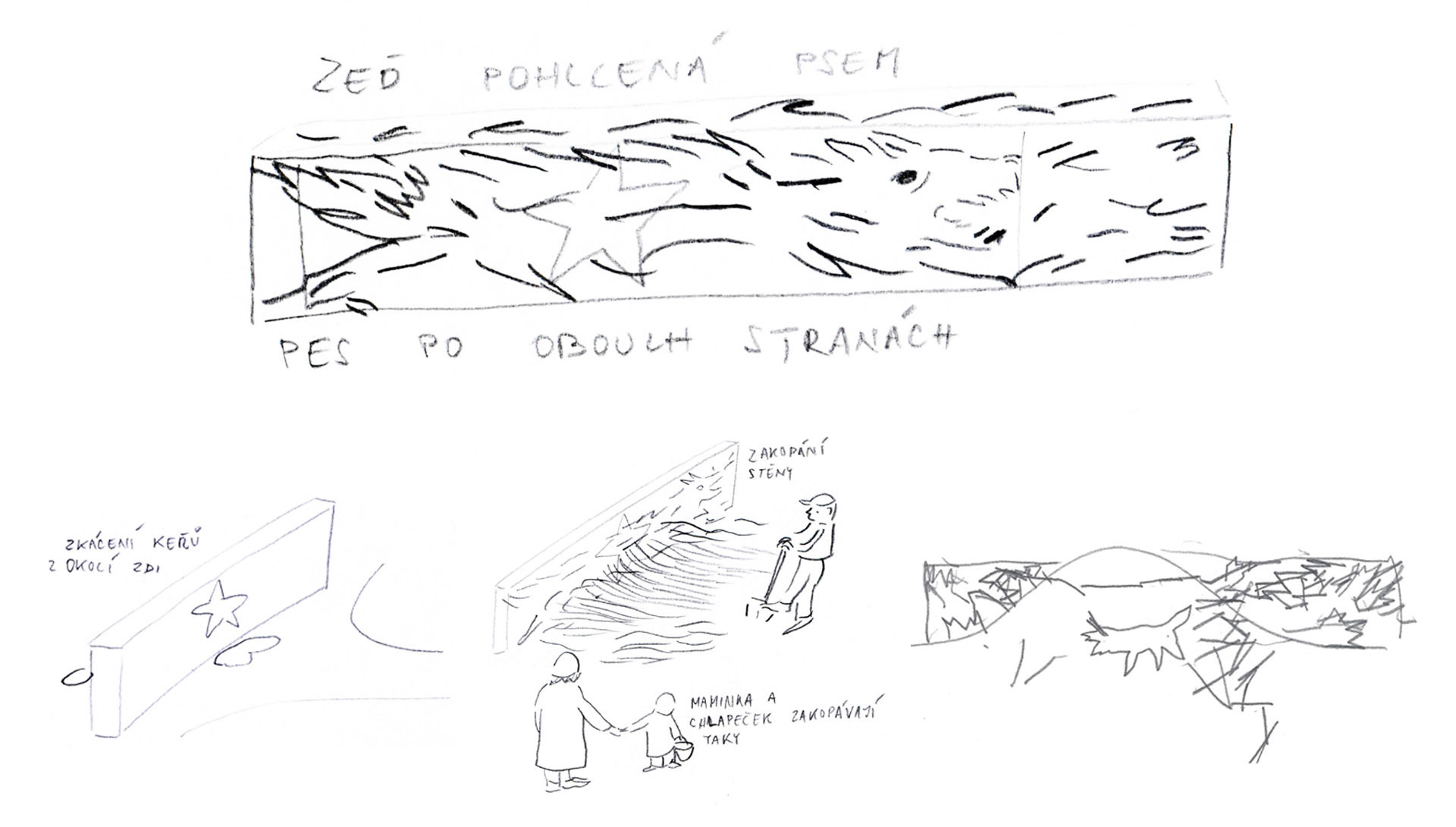 Zeď pohlcená kopcem se přiblížila mně i tobě. Sedíme. Jsme tu spolu. Oproti minulosti, kdy zeď ukazovala jen ty nejlepší, patří teď nám. Zmizela temná místa. Vidíme zeď zblízka a známe její příběh. Povídá se, že v kopci žije pes s ohnivýma očima, který pohltil hvězdu a střeží tak zeď před lidmi, kteří by ji znovu chtěli vykopat. Je to ten stejný pes, o kterém mi vyprávěla babička?
