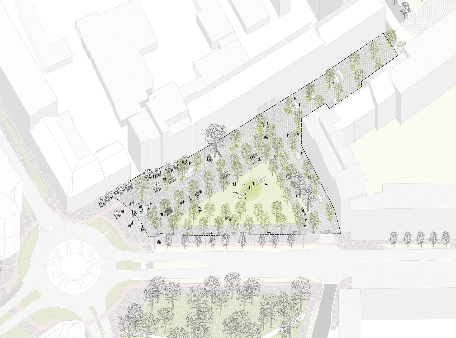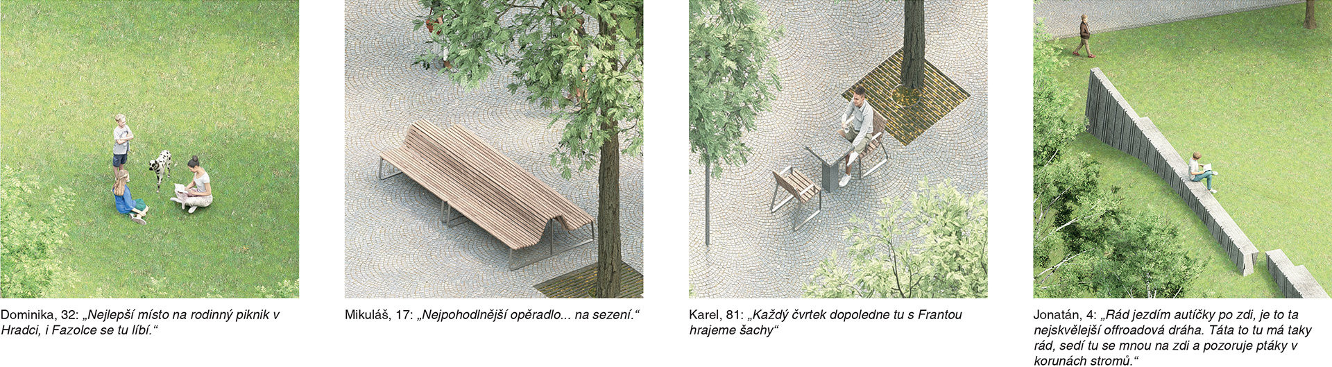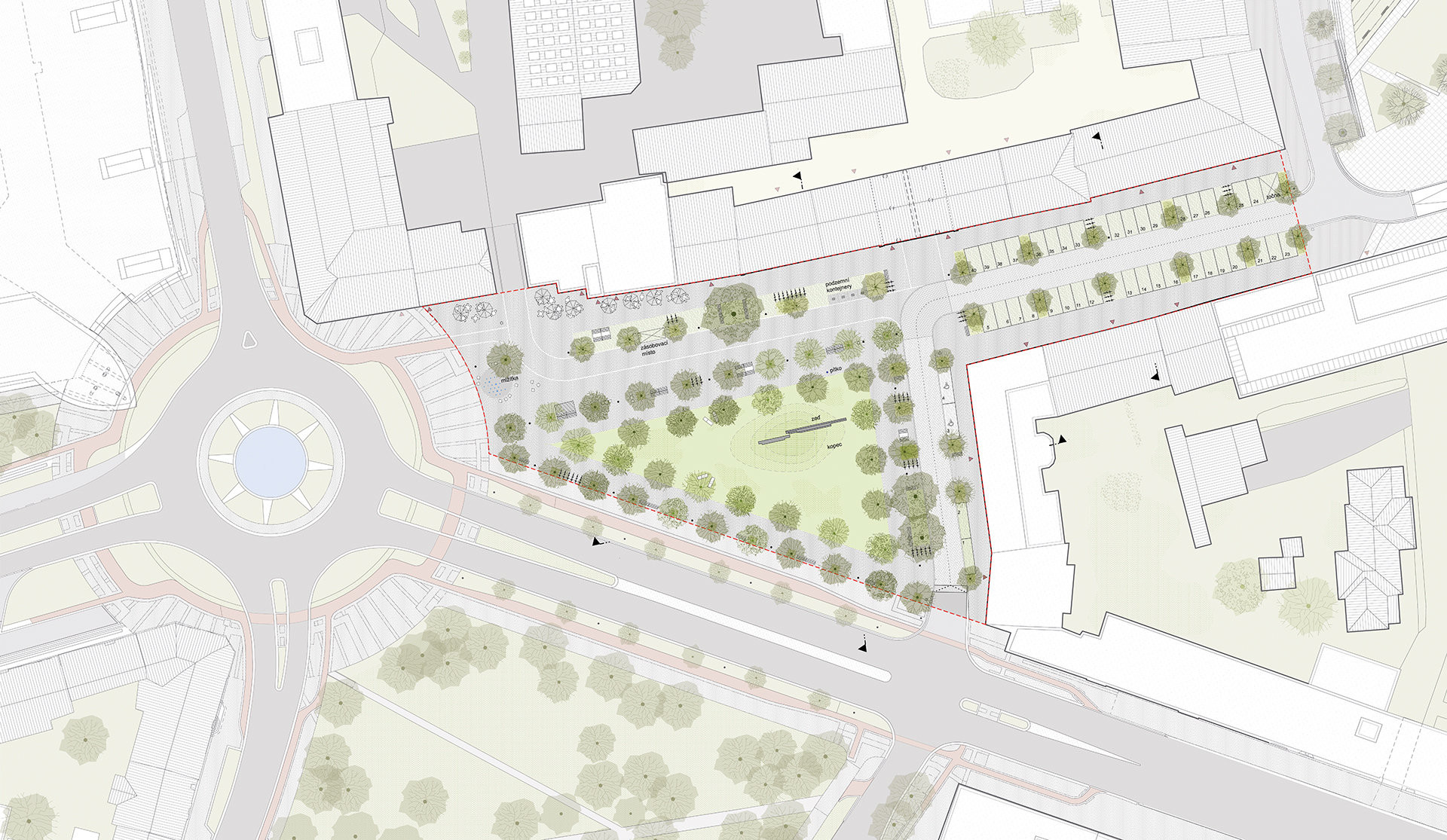 Celé zájmové území bude řešeno jednotně, budou zde použity stejné materiály i mobiliář. K většímu sjednocení pomůže i umístění vozovky ve stejné úrovni jako je chodník.