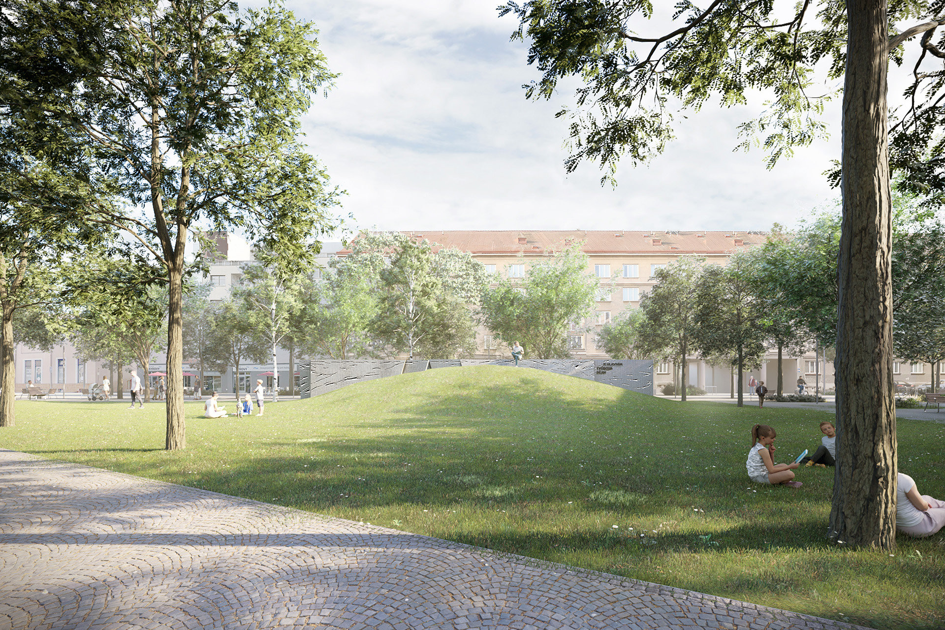 Vzniká zelený kopeček a my poznáváme vrchní hranu zdi. Je součástí nás a našich dějin. Vylezeme nahoru na kopec a vidíme kolem sebe. Rozhlížíme se a pozorujeme projíždějící auta, cyklisty a procházející chodce.