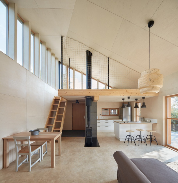 Nad zádveřím a kuchyní je půlpatro pro hosty, které je propojené s hlavním obytným prostorem a jídelnou. Celá tato část je otevřena až do krovu, který je z východní strany velkoryse prosklen, zejména kvůli rannímu slunci a také výhledu na Štramberskou Trúbu. Malá chodba propojuje tento hlavní obytný prostor s ložnicí a šatnou. Dále se z tohoto prostoru dostaneme do koupelny a na toaletu. Na protější stěně je vstup do dětského pokoje, který má opět spací půlpatro, které dává celému pokoji velkorysý prostor na malé ploše.