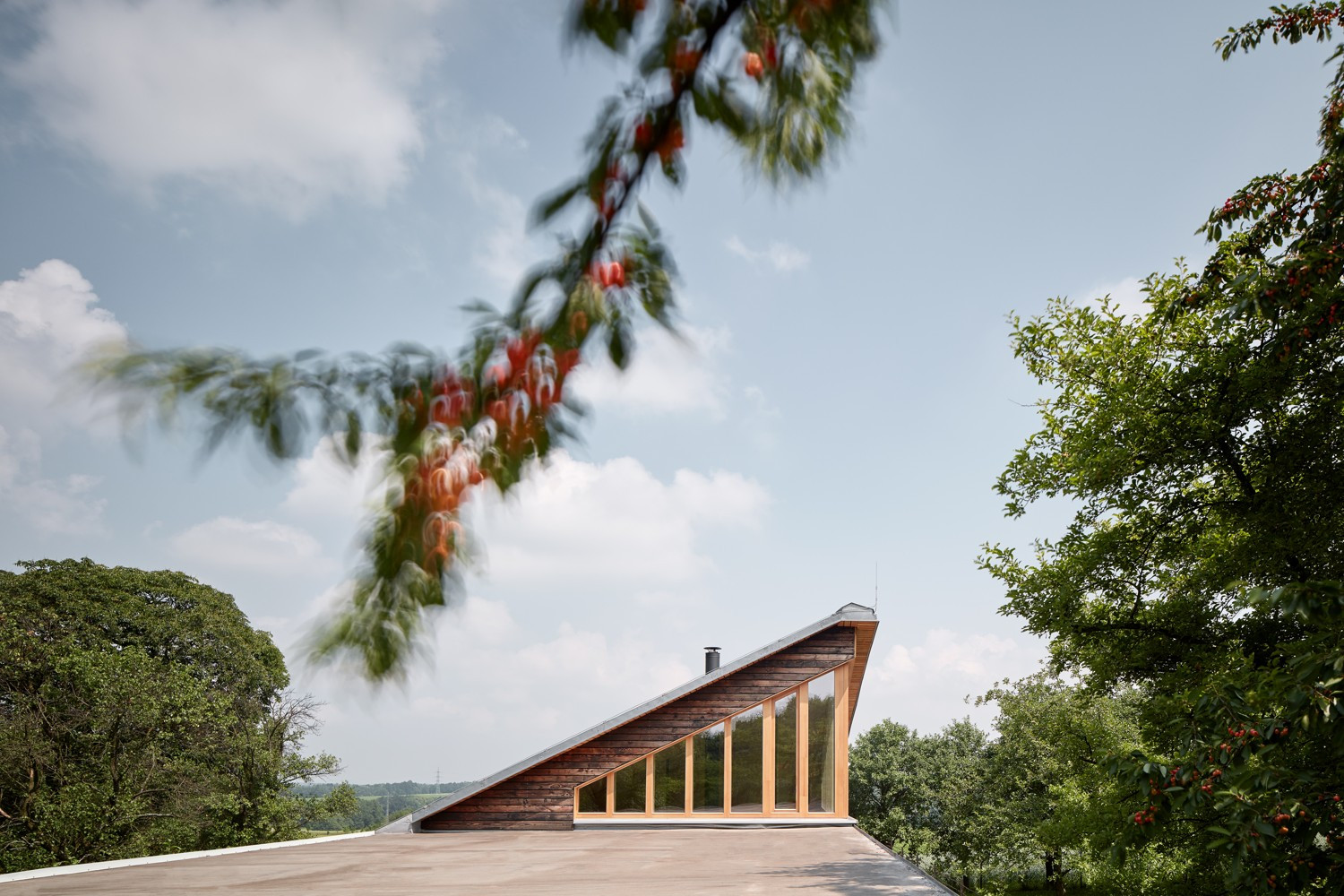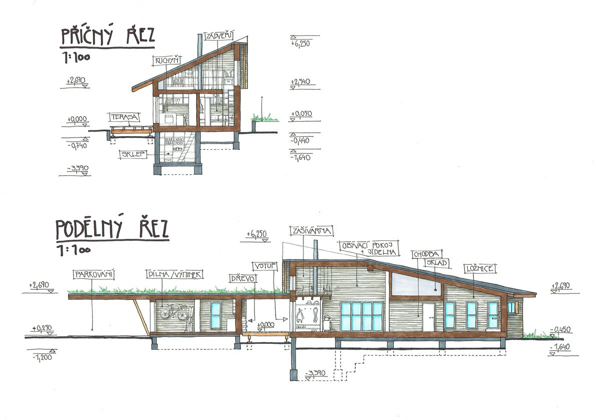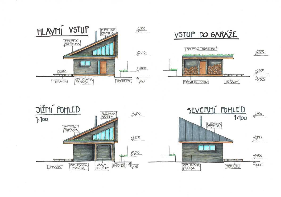 Samotný dům se skládá ze dvou objemů, obytného a technického. Vše propojuje střecha, která částečně kryje terasu se vstupem a zároveň tvoří stání pro dvě auta. Zastřešený vstupní předprostor má několik funkcí. Primárně tvoří chráněný vstup do domu i jeho technické části, dále slouží jako dřevník a v neposlední řadě je to malá odpočinková terasa na kafe.