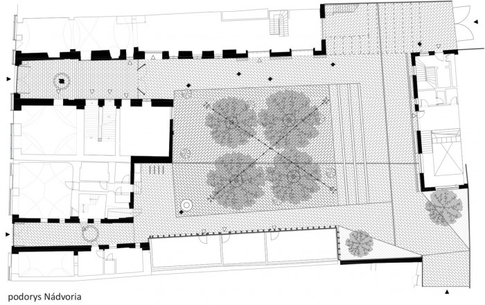 Nachádza sa tu mnoho rôznorodých poloverejných, či privátnych funkcií, ktoré nádvorie aktivujú, či už denne formou terasy reštaurácie, či retailov, alebo občasne formou eventov. Multifunkčný centrálny priestor je vymedzený štvoricou stromov, zmenou povrchu a osvetlením.
