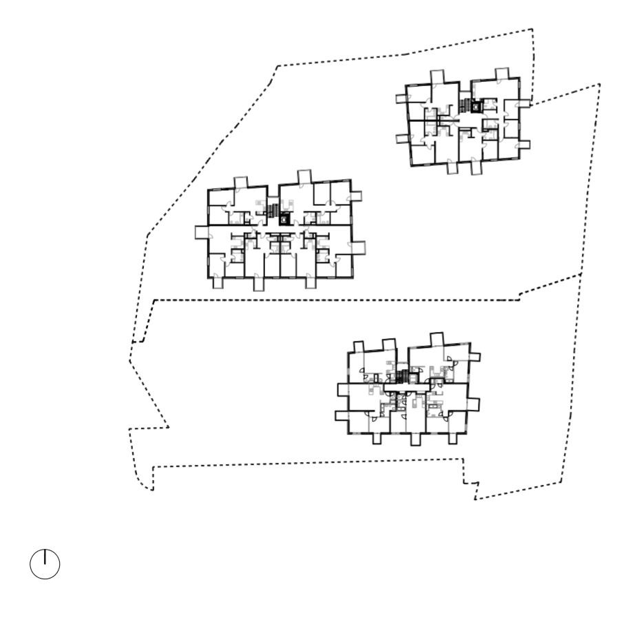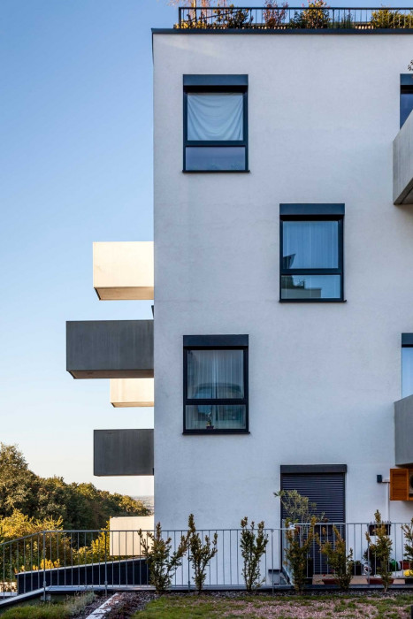 Svahovitý pozemok na okraji zástavby v najsevernejšej časti Dúbravky umožnil rozvinúť urbanistický koncept troch samostatne stojacich objektov vzájomne prepojených podzemnou garážou. Na streche garáže sme rozvinuli poloverejný priestor s výsadbou, s detským ihriskom, s malým multifunkčným športoviskom a privátnymi predzáhradkami bytov umiestnené v partery.