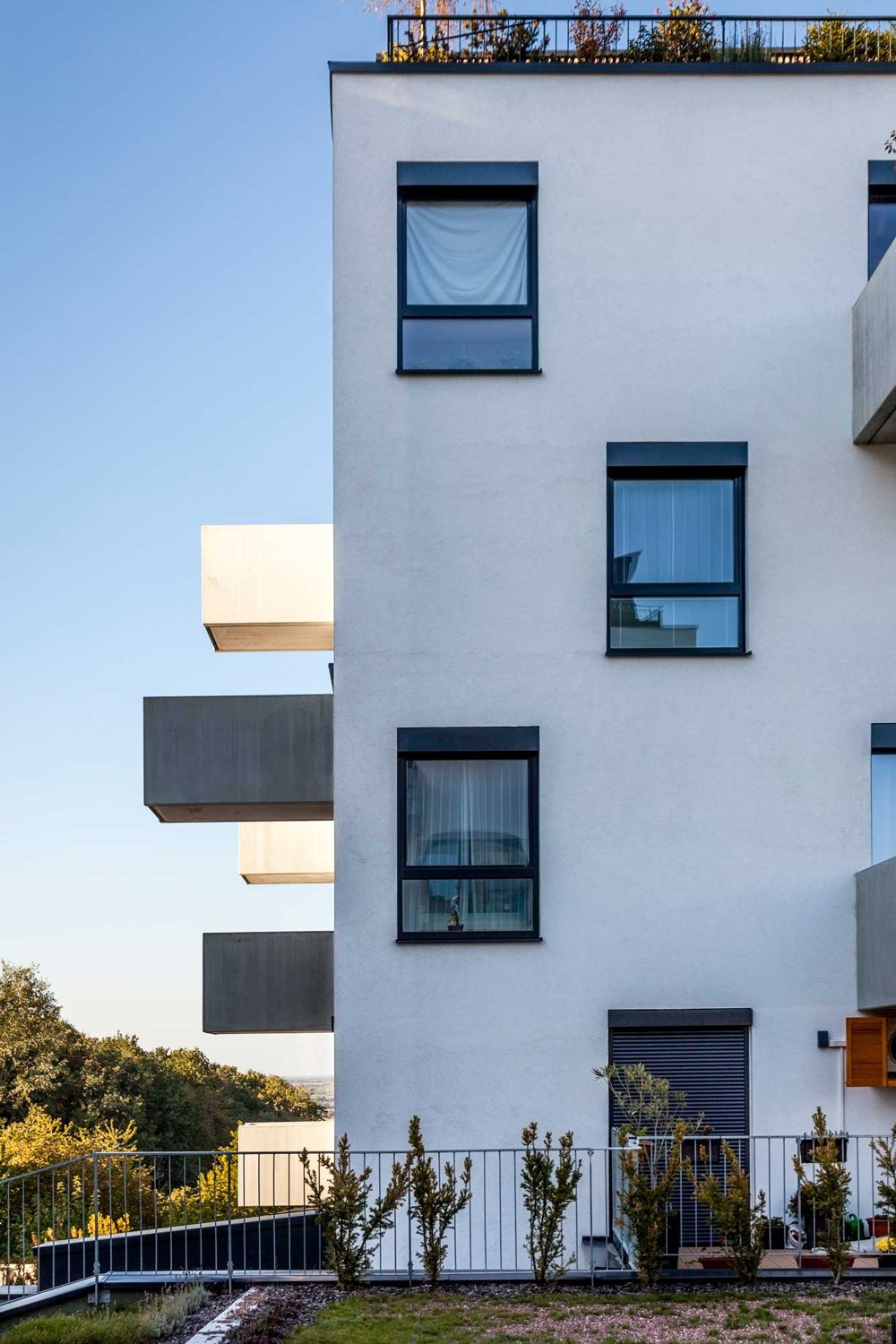 Typické podlažia tvorí biela fasádna omietka so šachovnicovo rozmiestnenými oknami v štyroch šírkach. Pre vytvorenie svetlých interiérov sme znížili parapety všetkých okien na minimum a tiež sme použili francúzke okná s nulovým parapetom. Po dodržaní predpísaných vertikálnych a horizontálnych požiarnych pásov sme okná na šachovnicovej fasáde opticky zvýšili priznaným nadokenným kastlíkom pre žalúzie vo farbe rámu okien. Koncept šachovnicovo rozostavených okien nie je samoúčelný, využili sme ho, pretože nám umožnil väčšie vyloženia obnažených betónových balkónov bez nepriaznivého ovplyvnenia svetlotechniky bytov na nižších podlažiach, najväčšie vyloženia balkónov majú od 2 do 2,5 m. Jednotlivé balkóny, sú vytvorené pomocou skladačky, spodná doska je odlievaná na stavbe a betónové prefa boky sú k nej primontované. Čelá balkónov sme ponechali sklenené aby sme zachovali prizodzený nádherný výhľad z francúzkych okien do átrií medzi budovami a tiež okolitej krajiny s peknými výhľadmi.