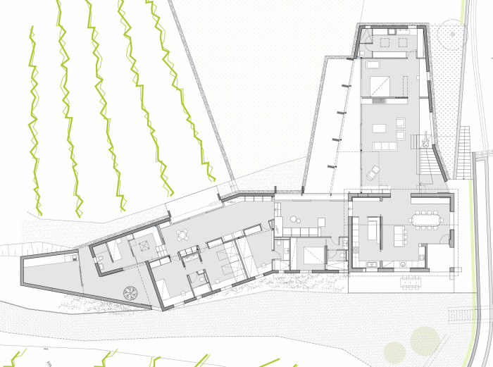 V dôsledku postupne sa zvyšujúcich priestorových nárokov na bývanie pre mladú rodinu vzniká idea rekonštrukcie, neskôr dostavby pôvodnej budovy so sedlovou strechou. Dostavbu tvoria dve lineárne krídla, spojené pôvodnou budovou, ktoré sú vsadené a kopírujú prirodzenú topografiu terénu a zároveň vytvárajú prirodzenú hranicu medzi vonkajšou vinicou resp. cestou a vnútornými sadmi. Celý dom tak na jenom podlaží otvorene komunikuje do vnútra s privátnym dvorom cez veľké otvory a naopak sa navonok uzatvára voči verejne prístupnej zóne susedných vinárskych závodov. Funkčne je prístavba rozdelená do dvoch krídiel: zónu pre deti a zónu pre dospelých. Obe zóny sa prelínajú v spoločnej kuchyni, ktorá sa nachádza v pôvodnej budove a stáva sa centrom diania celého objektu.