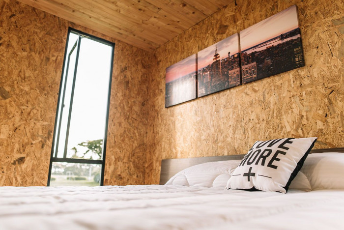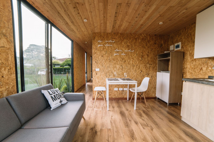 V interiéru převažuje využití dřeva, stěny jsou tvořeny z OSB desek a stropy jsou z borovicových prken. Pocit prostoru a vzdušnosti je umocněn posuvnými okny v salonku, jež sahají od podlahy až ke stropu místnosti a umožnují tak otevření domu do exteriéru. Poskytují také snadný přístup na přední terasu a udržují trvalé propojení exteriéru a interiéru.
