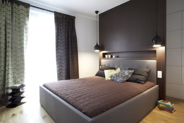 Zjednocujúcim elementom obytných miestností je podlaha z prírodného dubu. Spálňa je rozdelená na dva funkčné celky zástenou s dreveným obkladom v prevedení z dýhy wenge na spaciu čast a šatníkovú časť. Šatníková časť je otvorená a prístupná z dvoch strán postele. Na zadnej stene je úložná zostava, ktorá je na bokoch uzavretá a v strede sú umiestnené voľné vešiakové rámy. Hlavné osvetlenie spálne ako aj šatníka je opäť riešené bielymi valcovími svietidlami prisadenými ku stropu a na vedľajšie osvetlenie sú použité závesné lampy v tvare kvapiek čiernej lesklej farby.