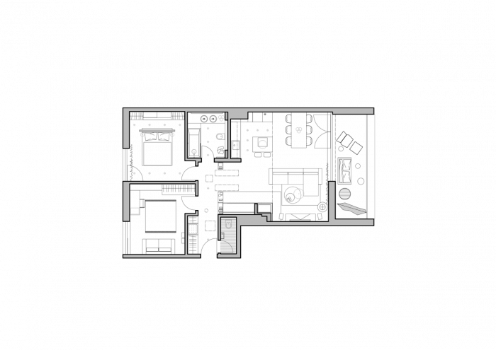 Interiér trojizbového bytu v bytovom dome na Kolibe má byť domovom pre mladých ľudí ponukajuci množstvo priestoru pre oddych a spoločne trávený čas vo veľkorysej dennej časti priestoru a rozľahlej terase s výhľadom. Dôraz pri riešení bol kladený na jasné funkčné členenie bytu, ako aj na estetickú a vizuálnu jednoduchosť celého priestoru od vstavaných nábytkových prvkov až po drobné doplnky a dekorácie a taktiež na vytvorenie dostatočného množstva úložných priestorov v nočnej i dennej časti.