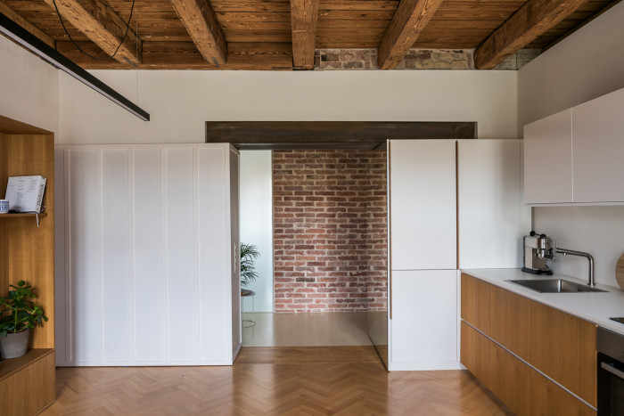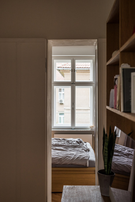 Byt sa nachádza v jednom z prvých nájomných domov v Bratislave postavenom pred sto rokmi. V 70. rokoch bol však výrazne prestavaný a o jeho veku už svedčí len datovanie a sochy od Aloisa Riegleho nad vchodmi. Byty v dome sú malé a utilitárne. Jeden z nich, podstrešný, dvojizbový, komprimujeme prestavbou na trojizbový. Jeho pôvodná priechodnosť nám nevadí, naopak, viac ju prepájame. Odhaľujeme strop, recyklujeme tehly, repasujeme okná a parkety. Použité materiály sú bežné, detaily sú kvôli svojpomocnej realizácii nenáročné technicky aj finančne. Prestavba trvá už štyri roky, a ešte bude pokračovať, chceme doplniť strešné okná, balkón a časom expandovať do podkrovia, ale neponáhľame sa.