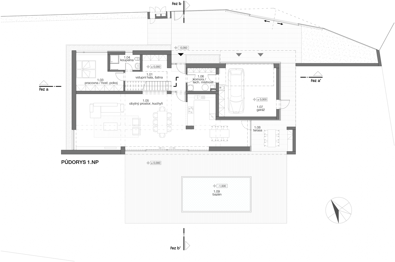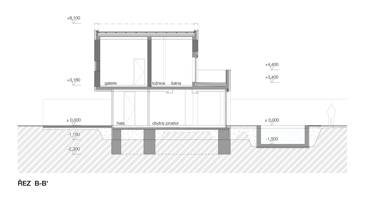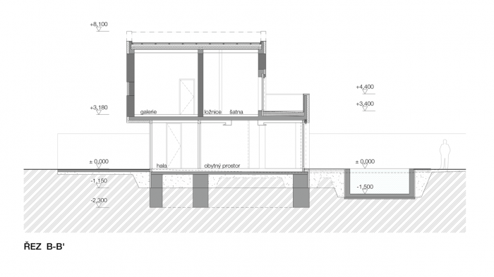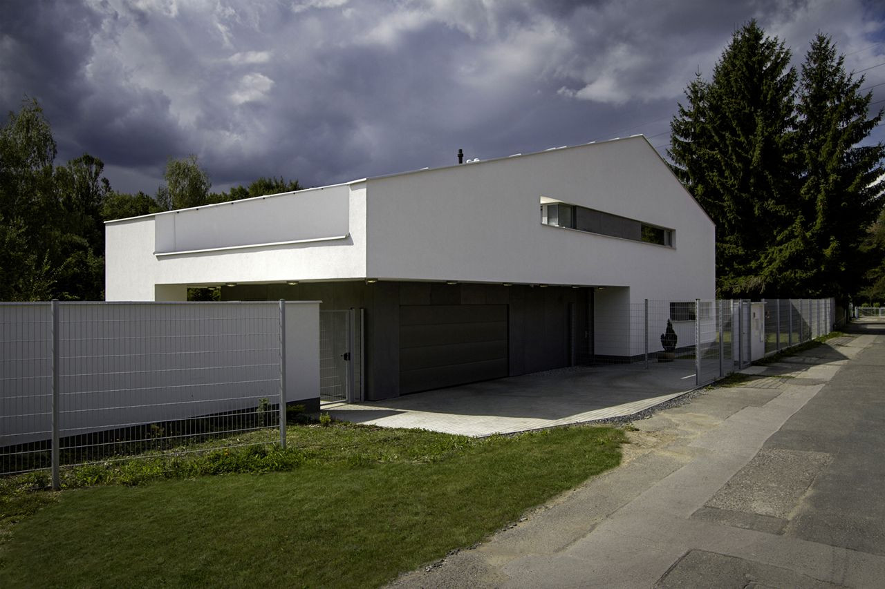 Podařilo se nám interpretovat klasickou a v místní zástavbě převládající sedlovou střechu novým způsobem, který odpovídal požadavkům klienta na současný moderní dům. V našem pojetí se tradiční tvar přetavil v pozvolně stoupající a klesající zeď, která se jako stuha vine kolem celého domu. Linie pozvolně stoupající asymetrické střechy je tvořena právě touto zdí rozpínající se přes parcelu. Části zdi jsou vynechány za účelem zdůraznění a krytí vstupu, jinde slouží průřezy pro otevření fasády domu jejímu okolí. Chtěli jsme dům vizuálně pevně spojit se zemí tak, aby působil trvalým dojmem, hmota domu vyhlížela solidně a pevně, a zároveň poskytnout klidný, lenivý pocit domu sebevědomě usazeného na pozemku. Vše je navrženo v bílé barvě s tmavými přírodně šedivými detaily v průřezech fasádou a šedým soklem tvořícím základnu domu.