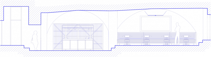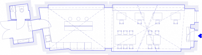 Dvojice kleneb přirozeně člení prostor na dvě části. Té u vchodu, kde je posezení pro hosty, vévodí lustr ve tvaru kříže a dlouhá lavice. Druhé části dominuje objekt pracovního stolu/baru a fortelný regál na víno. Do kleneb nezasahujeme, pouze je nasvětlujeme. Autenticitu a jedinečnost tomuto prostoru dodává jasanové dřevo, umná práce truhláře a zámečníka a návrh stolů, svítidel i lavice speciálně pro tento prostor. Není zde nic navíc.