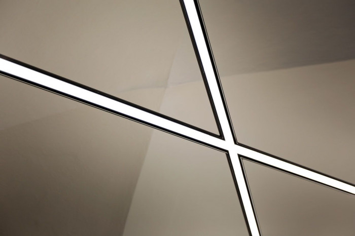 Osvětlení je řešeno LED pásky, což umožňuje maximální subtilnost zavěšeného lustru i nenápadné integrování osvětlení do kusů nábytku. Skleničky se stávají stínítkem, prosvětlené láhve s vínem vytvářejí jemné zabarvení celého prostoru baru.
