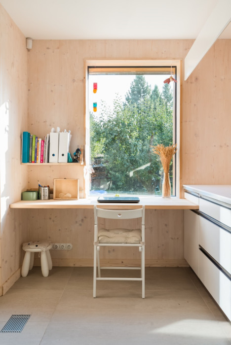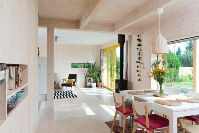 Nosná konstrukce je kombinací tesařských stropů a stěn z masívních dřevěných panelů Novatop. Povrchy všech dřevěných prvků jsou v interieru opatřeny tvrdým bílým voskovým olejem, stejně jako podlahy ze smrkových desek od stejného výrobce. Prořezy panelů jsou beze zbytku využity na prvky schodiště a volného nábytku.