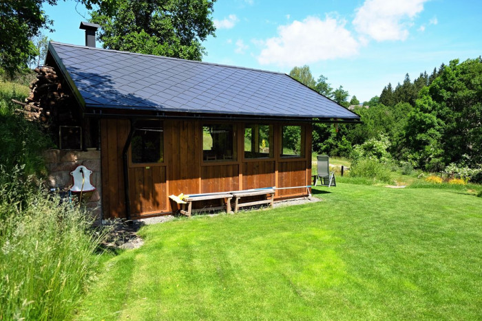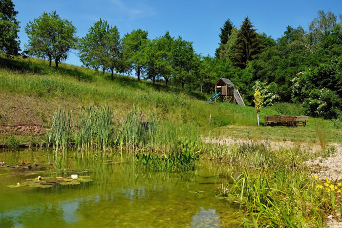 Neoplocená zahrada kolem domu navazuje na rozsáhlé louky a les. Na pozemku za chalupou je dětské hřiště, otevřené ohniště, velké koupací jezírko a uzavíratelný zahradní altán pro 18 osob s výsuvnými okny a kovaným krbovým grilem. U mola jezírka je solární sprcha s kapacitou až 40 litrů pro příjemné osvěžení nebo opláchnutí před a po koupání v jezírku. Rozloha jezírka je 300 m2, a v koupací části o rozloze 100 m2, je hluboké až 210 cm. Biotop je udržován zcela bez chemikálií, pouze s přispěním přítomné fauny a flóry za podpory mechanického filtru.