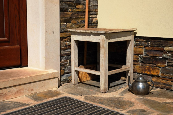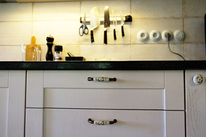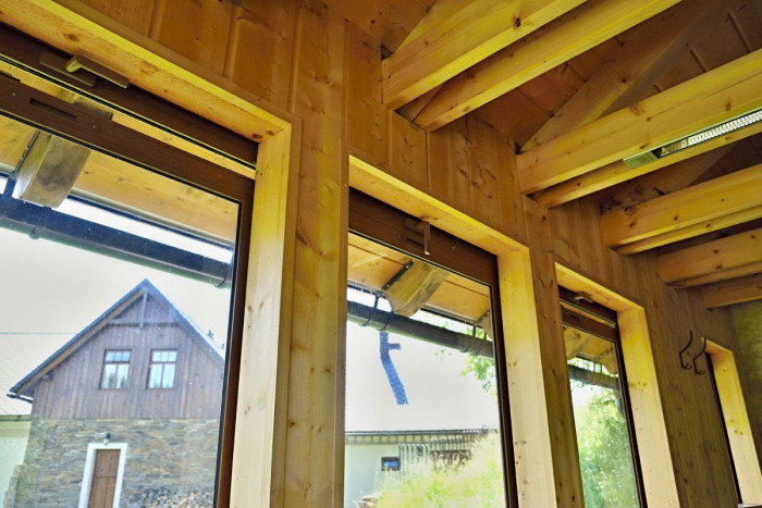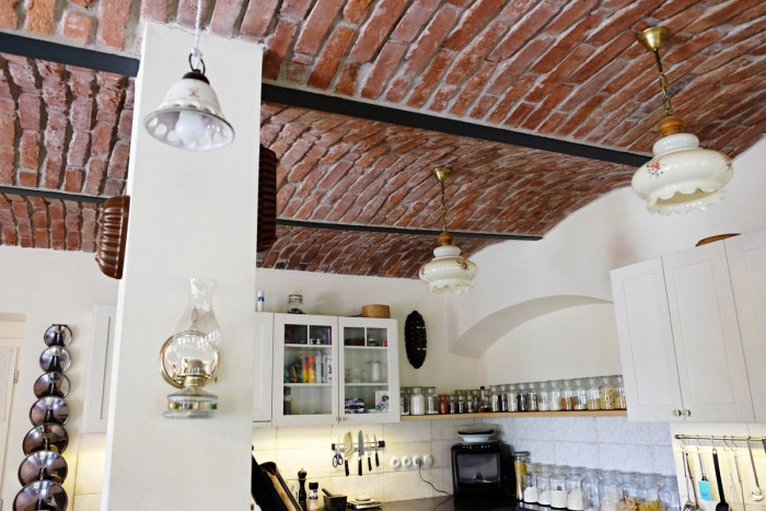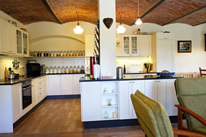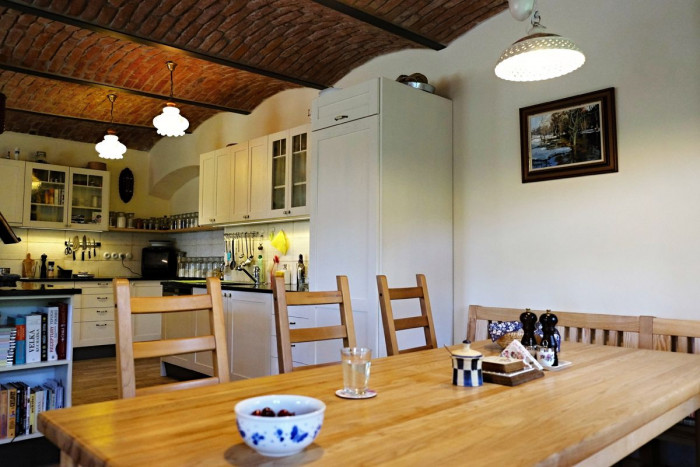 V interiéru převládají přírodní materiály. Podlaha je z masivních dubových flošen a kolem kuchyňské linky přechází v keramická dlažbu s povrchovou imitací dřeva. Nábytek je z větší části připraven truhlářem na míru, masivní jídelní stůl a židle jsou z jasanového dřeva. Hloubka parapetu u špaletových oken dána šíři zdí je úctyhodná, a sama okna s výhledem do zeleně díky jejich počtu a jemnému řemeslnému provedení, jsou dalších charakteristickým prvkem místnosti.