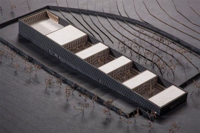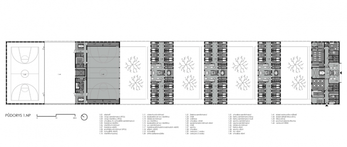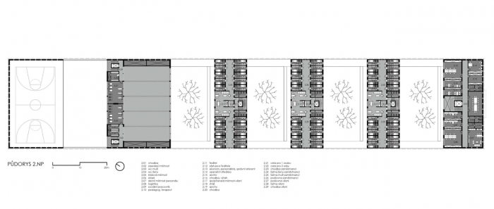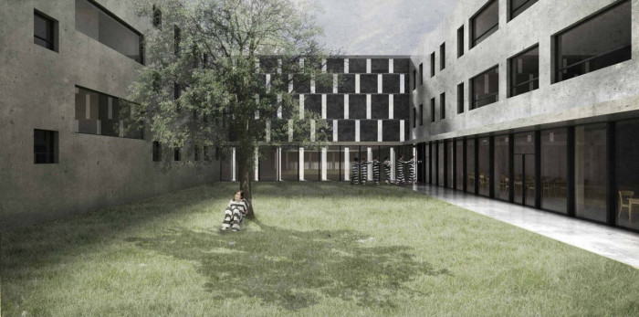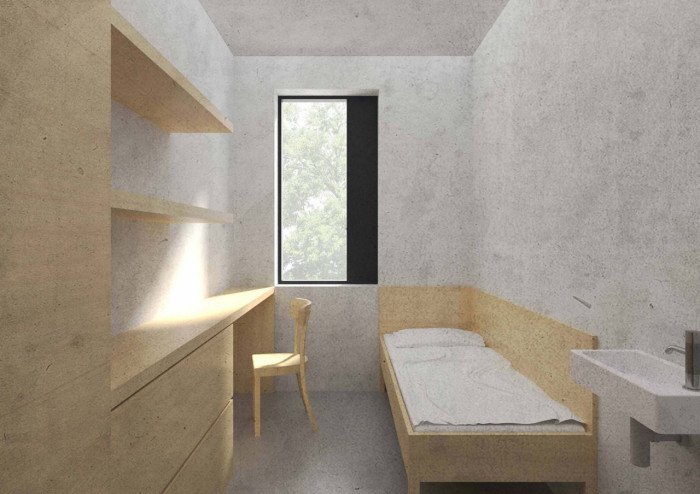 Objemy betonových bloků mezi sebou navzájem vytvářejí rozestupy, které tvoří travnaté uzavřené dvory, kde ke každému obytnému bloku přiléhá jeden uzavřený dvůr volně přístupný pro vězně. Přízemní patro bloku je prosklené a otevírá se směrem na jih do dvora se stromy.