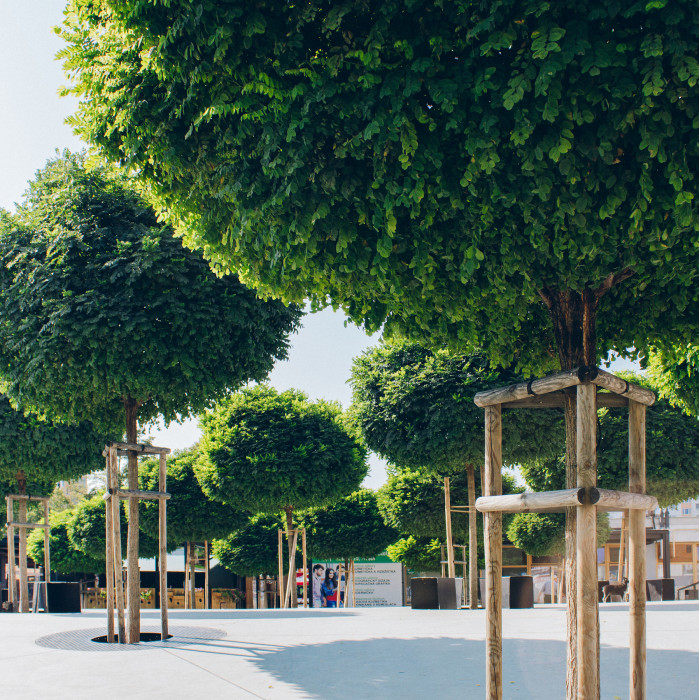 Geometrický charakter riešenia zelene podporuje jednoznačné definovanie centrálneho priestoru a dáva mu identitu. Výraznou zmenou by malo prejsť východné vyústenie pešieho ťahu smerom k Tomašíkovej ulici, kde navrhujeme nové schodisko a rampu.