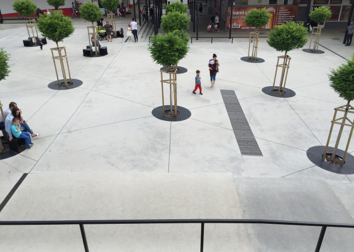 Dôležitým zásahom je prehodnotenie polohy i charakteru pôvodnej fontány. Vodný prvok, je realizovaný v podobe troch elementov, v rôznych častiach námestia. Tieto prvky su zabudované do plochy námestia a prejavujú sa v podobe prúdov vody striekajúcich z trysiek ukrytých pod oceľovými pochôdznymi roštami. Prúd vody dosahuje výšku 750 mm. Keďže centrálny priestor vnímame ako námestie, navrhujeme prehodnotenie stvárnenia zelene prítomnej v tomto priestore. Zeleň sa v našom riešení prejavuje ako organizovaná, parková, lokalizovaná v pravidelnom rastri-trojspone 6x6x6 m. Toto riešenie zabezpečuje prehľadnosť a priechodnosť vnútorného priestoru a jeho prirodzené rozdelenie na zóny, rovnako ako výtvarnú jednoznačnosť nového urbanistického riešenia. Vo väzbe na zeleň sú lokalizované na pevno zabudované lavičky integrované do ochrannej mreže k stromom slúžiace pre oddych a posedenie nakupujúcich i čakajúcich.Tieto sedacie prvky sú doplnené o typové lavičky lokalizované pri hlavných peších ťahoch.