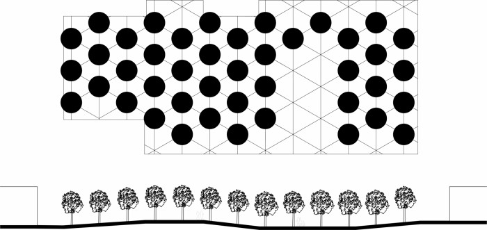 Dôležitým faktom je vykreslenie topografie koberca trojuholníkovým rastrom dilatačných celkov súvisiacich s rastrom zelene. Výtvarný koncept stavia na elementárnej geometrii, ktorá si vyžiada jednoduchú a elementárnu materiálovú koncepciu. Koberec bude stvárnený na báze liateho betónu s profiláciou- protišmyková úprava. Materiálová mozaika horizontálnych plôch bude doplnená o trávnaté plochy, drevené terasy a betónové dlažby uplatňujúce sa po obvode areálu. Koncepcia osvetlenia areálu naväzuje na základnú geometrickú kostru celého riešenia. Svietidlá sú osadené ku každému solitérnemu stromu, osvetľujúce jeho korunu, vytvárajúc trojspon o dĺžke strany 6,0m.