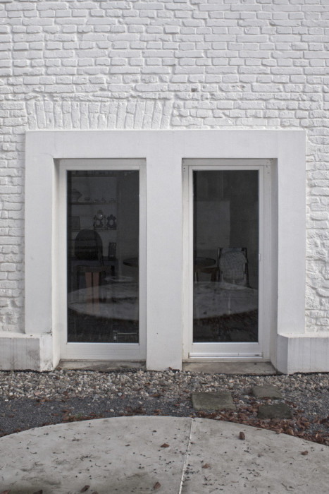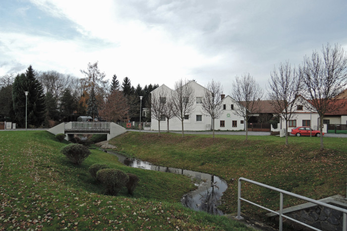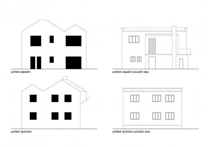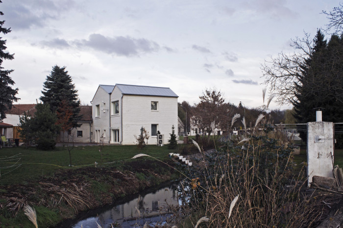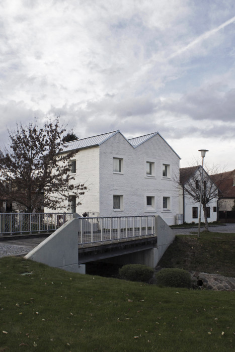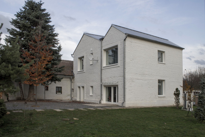 Určujícím impulzem pro náš návrh bylo uvědomění, že dům svou velikostí a měřítkem odpovídá tak jeden a půl násobku okolních domů. A tak jsme z něho udělali dva domky, větší a menší. To nám také napovědělo členění oken původního stavu. Dům má do návsi dva štíty. Členění na "dva domky" se propisuje v oknech, štítech ale také ve vnitřním uspořádání celého domu. Menší "domek" je reprezentativní částí. Je zde umístěna hala, obývací pokoj a pracovna. Větší "domek" naplňuje rodinné zázemí. Západní fasáda domu a hospodářské kůlny vymezují směrem do zahrad dvorek se starou rozeklanou třešní. Tímto směrem se dům otevírá vstupy a širokými okny. Vše sedí stále nalajnováno logikou celého domu. Výhledy z patra nabízejí poetické panorama střech okolních domů proložené plány stromů a keřů zahrad.
