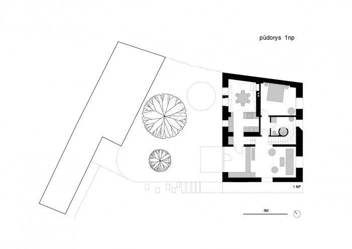 Původní stav domu jsme poměrně upravili. Nebyl nám však překážkou. To, co bylo cenné, jsme zachovali a to, co dispozičně a funkčně pozbývalo významu, jsme odstranili. Zvláště cenné jsou dvě sousední místnosti s klenbami. Z jedné, klenuté českou plackou, jsme udělali jídelnu. Druhá, s valenou klenbou, se stala kuchyní. Z jídelny je přímý vstup na dvorek. Tyto místnosti jsou navázány na vstupní halu a vyrovnávací schody do obývacího pokoje a schody do patra. Reprezentativní část domu se vstupní halou, obývacím pokojem a pracovnou je opticky i prostorově provázána. Část obývacího pokoje má prořezaný strop až do patra, ve kterém je pracovna. V přízemí je ještě umístěna ložnice a sociální zázemí. V patře je pak hala, dva pokoje a zmíněná pracovna.