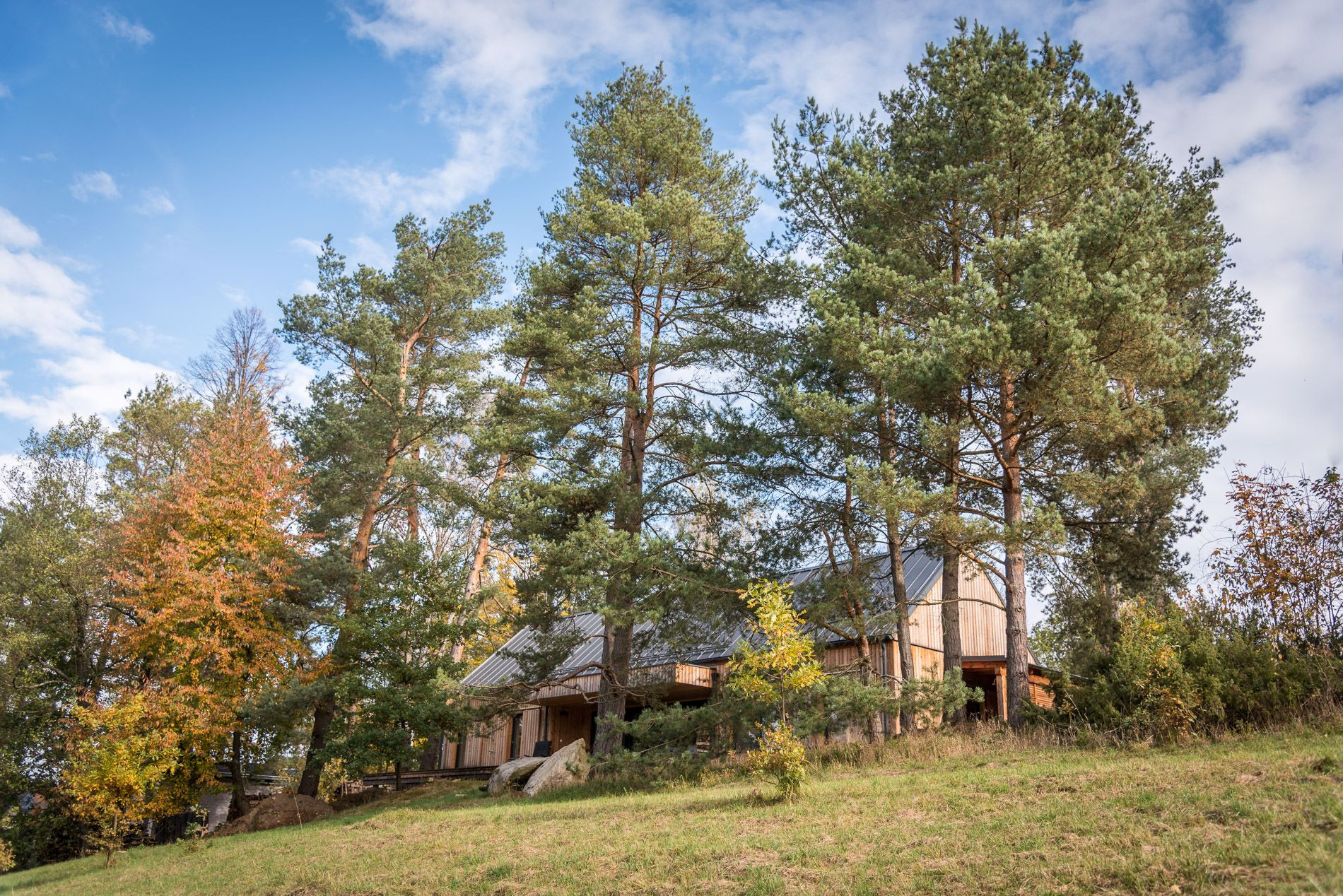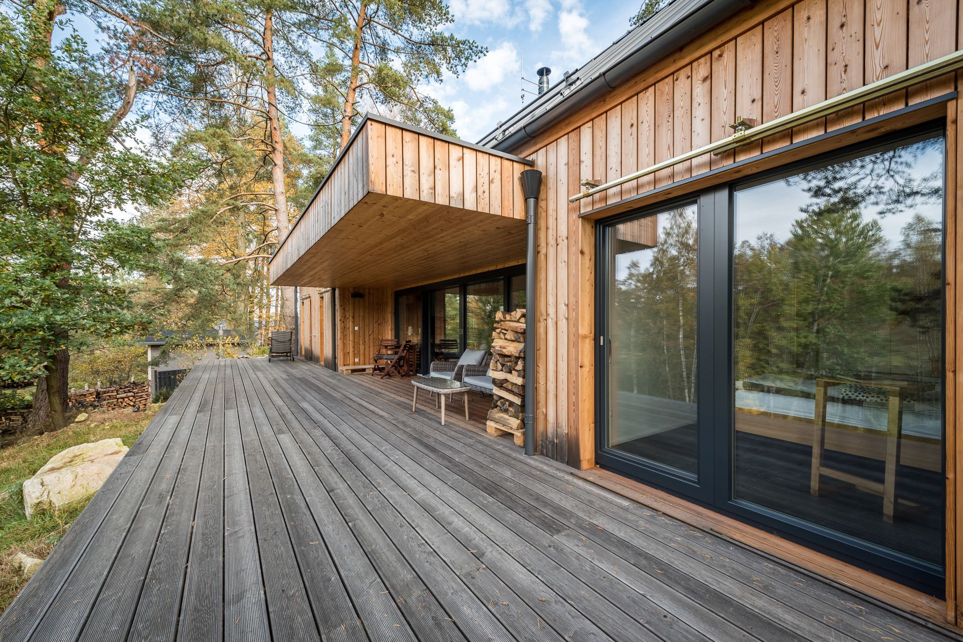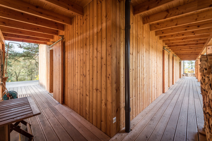 Použití dřeva jako hlavního konstrukčního i pohledového materiálu přináší řadu výhod – dřevo je obnovitelný zdroj, skvěle izoluje, a při správném ošetření stárne s elegancí. Obvykle se využívají odolné druhy jako sibiřský modřín, který časem získává přirozenou patinu a nepotřebuje složitou údržbu.