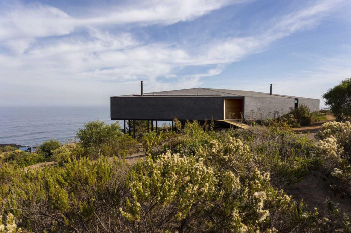 Loftový modulární dům shlíží ze svažitého pozemku na oceán