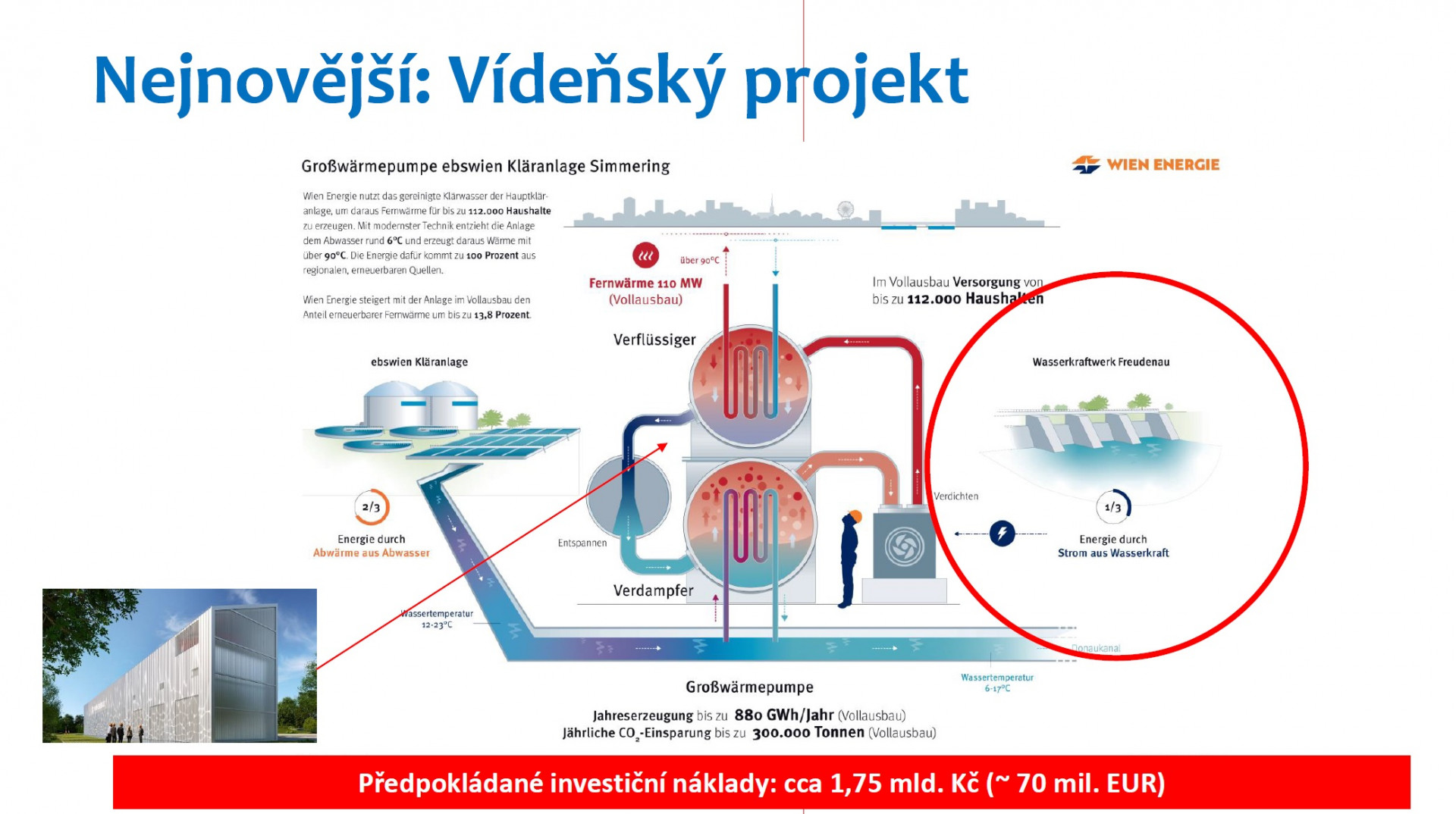„Při představení významných budoucích staveb a městských čtvrtí podél vltavských břehů nelze opomenout také další rozvoj pražské Ústřední čistírny odpadních vod. Tato běžná součást infrastruktury města v sobě skrývá výjimečné bohatství, které bylo doposud skryto veřejnosti – odpadní teplo obsažené v odpadních vodách. Každou vteřinu čistírnu opouští tři metry kubické vyčištěných odpadních vod majících i v nejchladnějších měsících 15 °C. Za hodinu to je 11 tis. m3, za den 260 tis. kubíků a za rok téměř 100 mil. m3 vody. V této chvíli energetické krize nastal čas se o tuto energii, na jejímž vzniku se podílel fakticky každý obyvatel města, zajímat a začít ji zpětně využívat,” říká energetický expert Tomáš Voříšek.