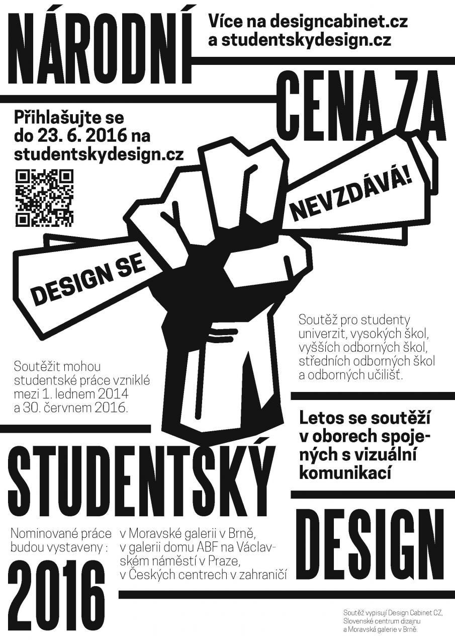 Design Cabinet CZ společně s Moravskou galerií v Brně a Slovenským centrem dizajnu vyhlašuje 26. ročník soutěže o Národní cenu za studentský design 2016 pro obory zahrnuté pod termínem vizuální komunikace (grafický design, plakáty, knihy, brožury, vizuální styly, typografie, navigační a orientační systémy, experimentální přístupy v grafickém designu, grafický design v mezioborové spolupráci, užitá grafika, reklamní fotografická tvorba vztahující se k designu, graffiti, digitální média, motion design, nová média aj.).