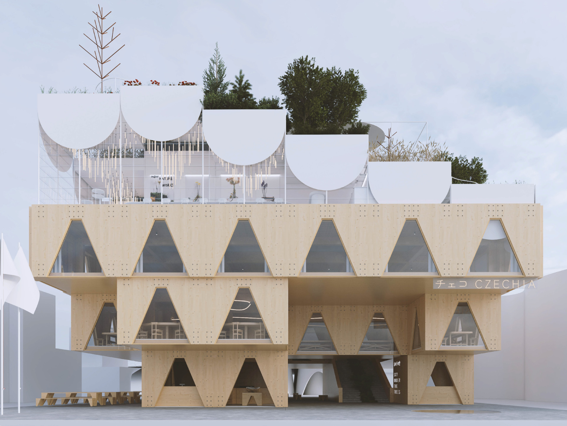 Odbornou porotu nejvíce zaujal návrh českého pavilonu od architektonického studia Apropos Architects ve spolupráci s Terezou Šváchovou a Lunchmeat studio. Studio s mezinárodním přesahem a zkušenostmi má vedle Česka zastoupení i ve švýcarském Curychu a nizozemském Haagu. V rámci evropských měst studio realizovalo řadu projektů od bytových domů až po velké urbanistické celky. “Tématem našeho pavilonu je ´sochání vitality´. Fasáda je navržena z tabulového spékaného skla, přičemž využití skla bylo pro nás jasnou volbou už od začátku. Řemeslné zpracování skla na českém území má nesmírnou tradici a jeho využití nám logicky zapadlo jak do tématu světové výstavy EXPO, tak do námi zvoleného tématu vitality. Jako společnost se budeme dožívat vyššího věku v plné síle. K posílení vnitřní vitality si potřebujeme uvědomovat i společenské a kulturní hodnoty, neustále si je připomínat a posilovat. Proto pavilon ze dřeva a skla, řemeslně a kreativně pojatý, naplněný českým umem a kreativitou. Ve tvaru dynamické spirály jako té nejideálnější cesty,” vysvětluje pojetí vítězného návrhu architektka Nikoleta Slováková ze studia Apropos Architects.
