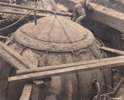 Stavba započala vyhloubením jámy o průměru cca 5,5 m a následným vybetonováním základového mezikruží s prohloubením uprostřed, kde bylo obvykle drenážní potrubí pro odvodnění v močálovitém podloží, popř. pro odčerpávání přebytečné vody během stavby. Na mezikruží byl umístěn rozebíratelný prstenec trojúhelníkového profilu ze dřeva nebo plechu, tvořící základ pro usazení balonu a současně přechod z kulového tvaru na válcový. Těžký nafukovací gumový balon měl průměr 3 m a tvořil vnitřní bednění. Byl natlakován na cca 0,15 atm a pak se přes něj rozprostřelo ochranné plátno, zabraňující přilepení betonové směsi. Následovalo vyztužení ocelovou sítí s připevněnými dřevěnými špalíky, zajišťujícími její správnou polohu. Výztuž byla upravena podle bednění vstupní chodbičky, výklenku pro kamna a průduchů pro kouřovod a pro větrání. Vnější bednění ve vzdálenosti cca 600 mm od balonu tvořily plechové segmenty sešroubované do tvaru koule se seříznutým vrcholem, přičemž dolní polovina měla stěny téměř svislé. Nad otevřený vrchol byl umístěn plechový kužel zajišťující rozprostření řídké betonové směsi po celém obvodu. Její hutnění dřevěnými tyčemi provádělo několik dělníků. Míchačka na pásovém podvozku byla po pracovní plošině zatažena přímo nad objekt. Po dokončení betonáže se bednění uzavřelo přiložením plechového vrchlíku.