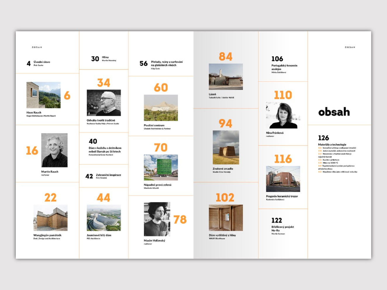 / 1/ Editorial / 4/ Úvodní slovo – Petr Suske / 6/ Haus Rauch / 16/ Martin Rauch / 22/ Wangjingův památník / 30/ Hlína / 34/ Odvaha tvořit tradičně / 40/ Fotoeditorial / 42/ Zahraniční inspirace / 44/ Jasmínově bílý dům / 56/ Přeludy, ruiny a surfování na globálních vlnách / 60/ Pouštní centrum / 70/ Nápadně pravá zelená / 78/ Maxim Velčovský / 84/ Lázeň / 94/ Zvukové zrcadlo / 102/ Dům vytištěný z hlíny / 106/ Portugalský fenomén azulejos / 110/ Nina Fránková / 116/ Pragerův keramický trezor / 122/ Břidlicový projekt Ne-Ro / 126/ Materiály a technologie