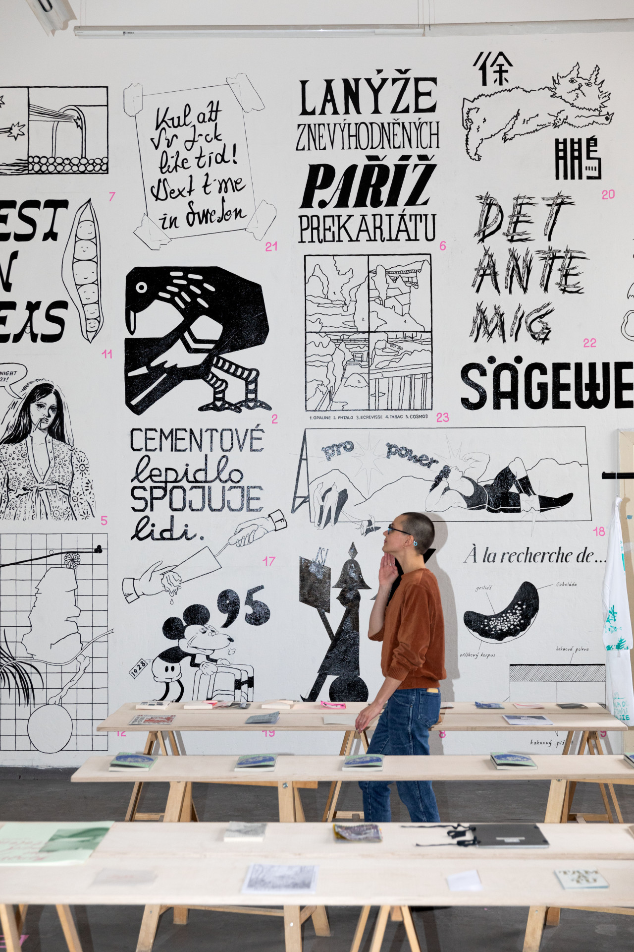 Ateliér Ilustrace a grafiky / Juraj Horváth, as. Michaela Kukovičová: Journal — inspirace žánry novin, výsledky workshopů: Kopíruj mistry, Signpainting training, Pilotní osmička... // klauzura: Píseň v obrazech — text písně zpracovaný do obrazové tabule k předvádění příběhu pro veřejnost.