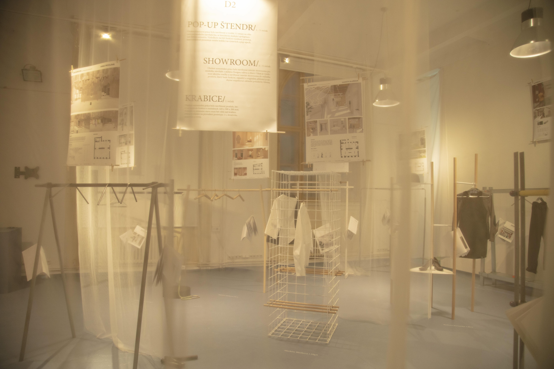 Ateliér designu nábytku a interiéru / Roman Vrtiška, Vladimír Žák, as. Petr Hák: 1. ročník – Krabice – vytvoření produktu, který se musí vejít složený do krabice daného rozměru; 2.–5. ročník – Showroom/obchod pro návrháře z Ateliéru designu oděvu a obuvi – návrh interiéru reálného prostoru s důrazem na technické zpracování