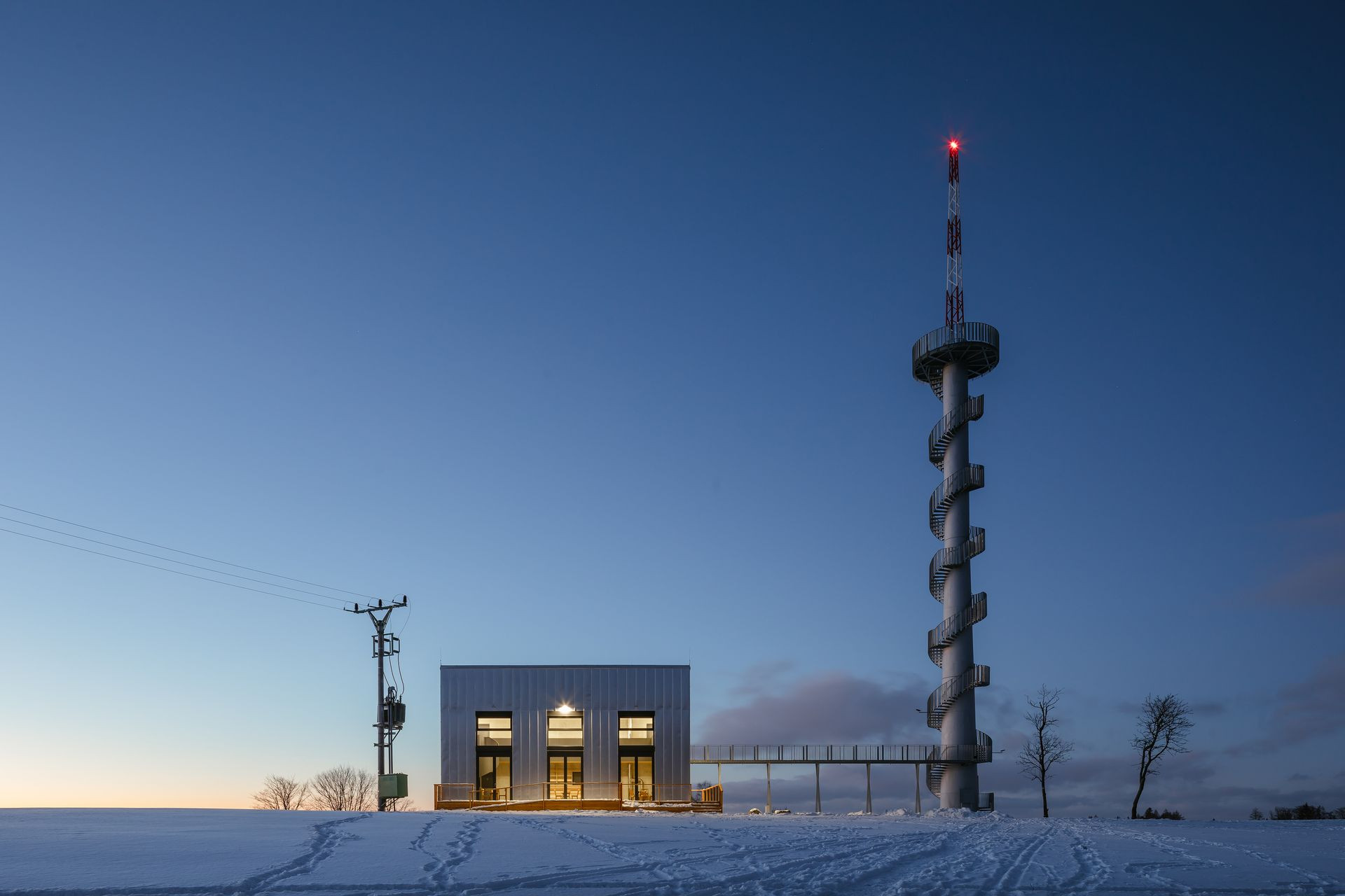 Rekonverze tubusu větrné elektrárny s transformovnou na rozhlednu s turistickým infocentrem na vrchu Šibeníku u Nového Hrádku od Pavla Suchého a Pavla Ježka ze studia ABM architekti, realizace 2020
