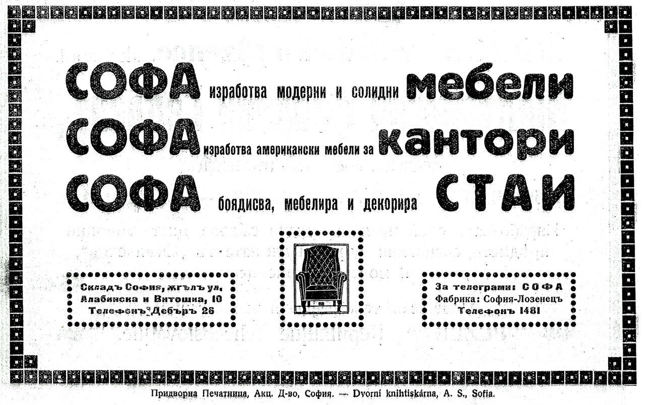 V roce 1919 byla v Sofii založena továrna na nábytek Sofa. Její zakladatelem byl Václav Pospíšil, který do Bulharska přijel v roce 1913 a pracoval u Františka Němečka jako projektant a zpracovatel nábytku. Specializoval se jako samouk-architekt interiérů a po 1. světové válce svou působnost rozšířil založením továrny. Kromě moderního a kvalitního nábytku továrna vyráběla „americký“ kancelářský nábytek a zařizovala a dekorovala interiéry (obr. 3). V roce 1926 vyhořela, ale v následujícím roce Pospíšil společně s dalším Čechem Voznickým a Polákem Kardelasinským založil akciovou společnost Sofa a výrobu obnovil. Další osud i této továrny není znám.